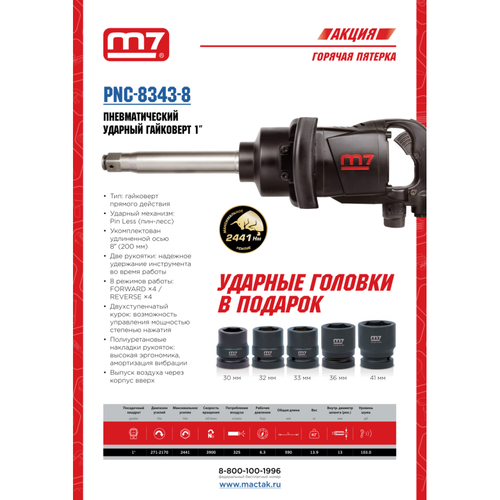 MIGHTY SEVEN Гайковерт пневматический ударный 1", 2441 Нм, удлиненный, в комплекте 5 торцевых головок