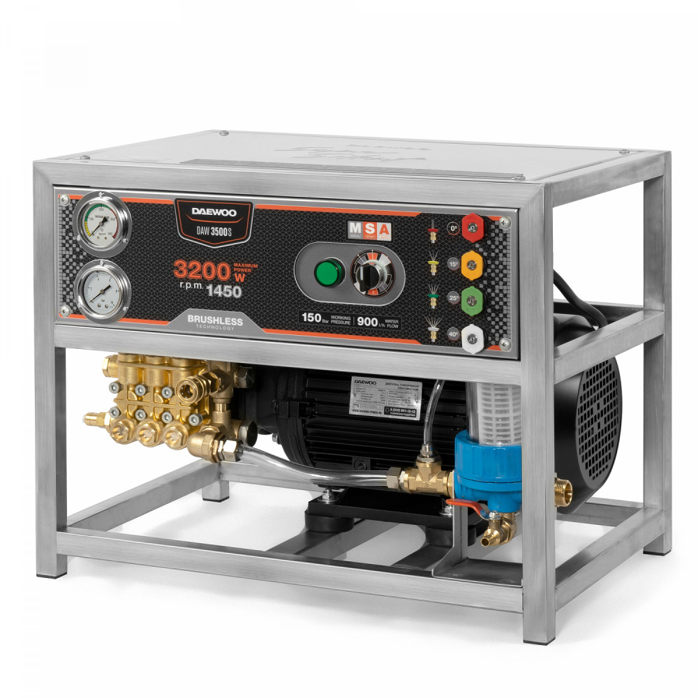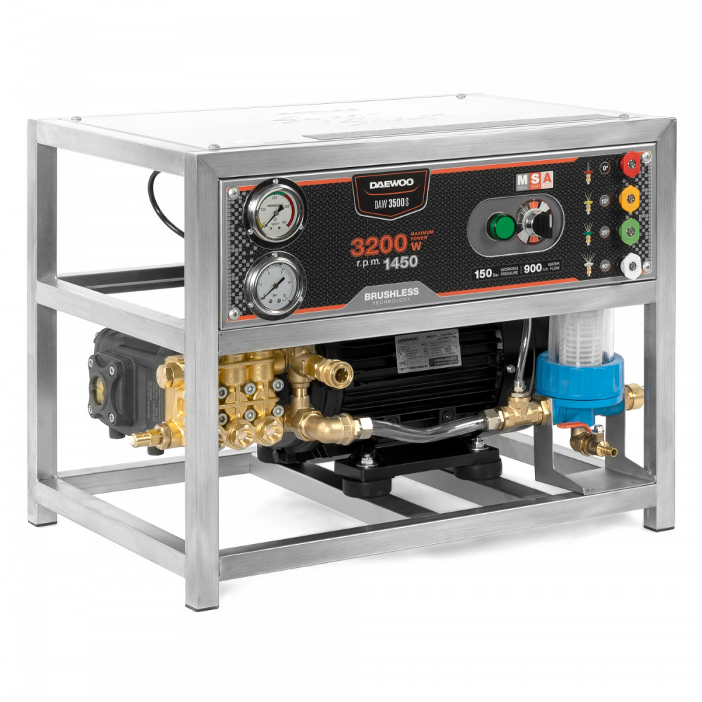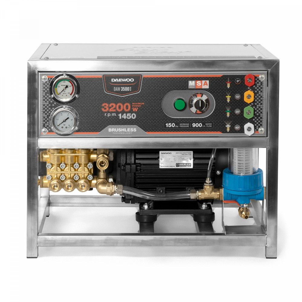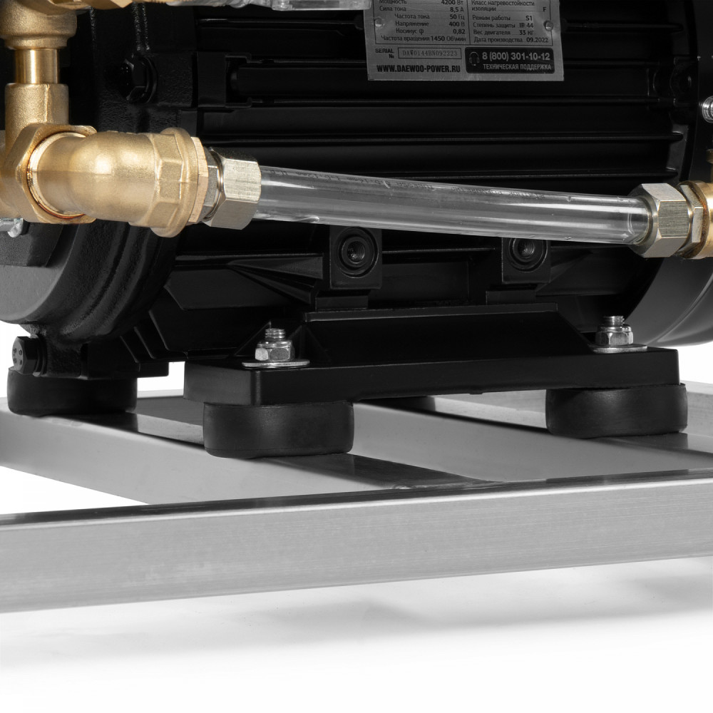 - Электрический бесщеточный двигатель DAEWOO. Асинхронный 4-х полюсной двигатель мощностью 3200 Вт обладает высоким крутящим моментом и увеличенным ресурсом работы в тяжелых условиях частых включений.