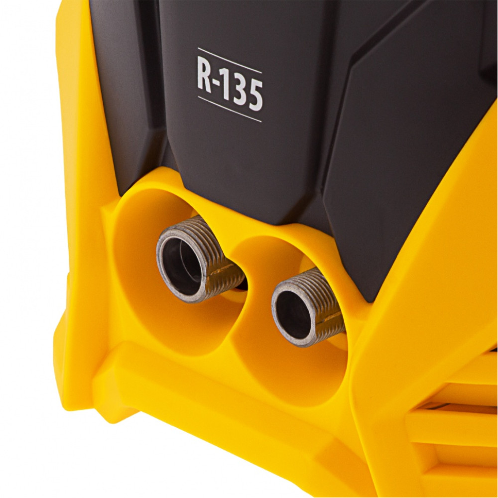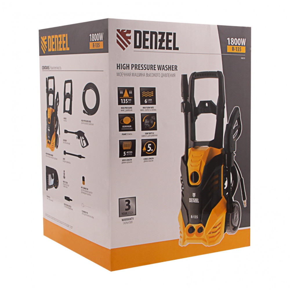 Колесная моечная машина высокого давления Denzel R-135 58233 производительностью 6 л/мин, мощностью 1800 Вт, с максимальным давлением 135 бар, используется для мытья автомобилей, садового инвентаря, велосипедов, дорожек и заборов. Мощный мотор и помпа высокой производительности позволяют быстро справляться даже с серьезными загрязнениями. Если нет доступа к водопроводу, мойка может осуществлять забор воды из резервуара в режиме самовсасывания, теряя при этом всего 5% давления.