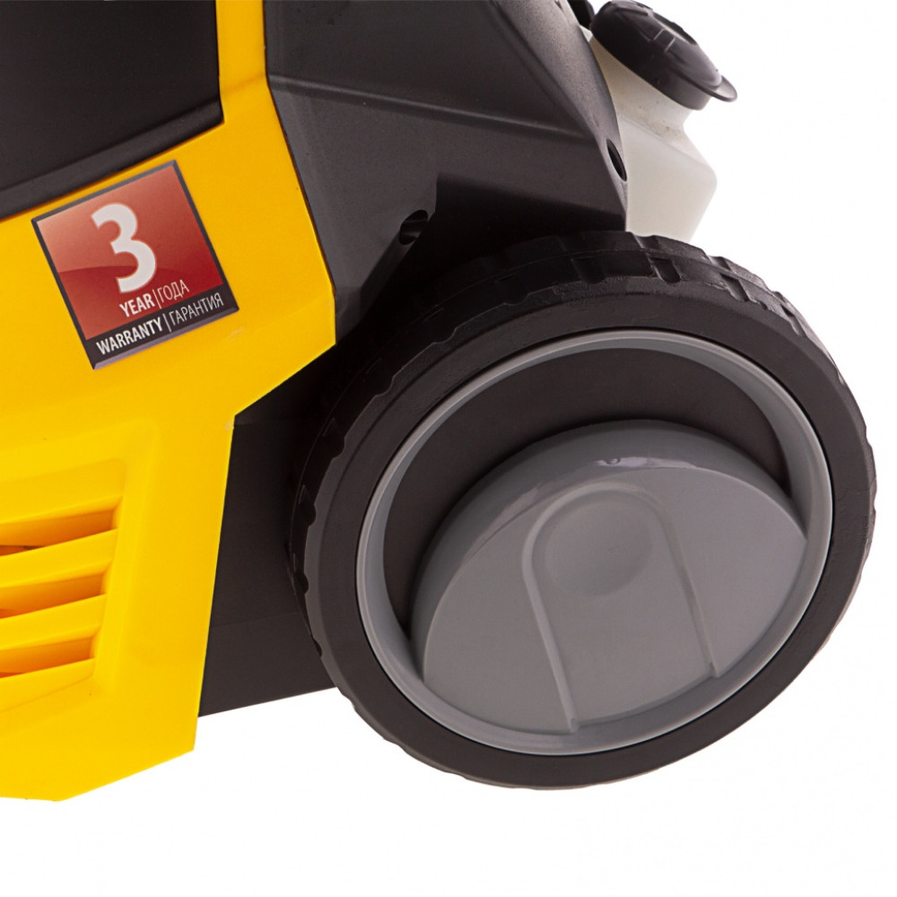 - Удобная транспортировка — мойка оснащена колесами, а на корпусе предусмотрена ручка.