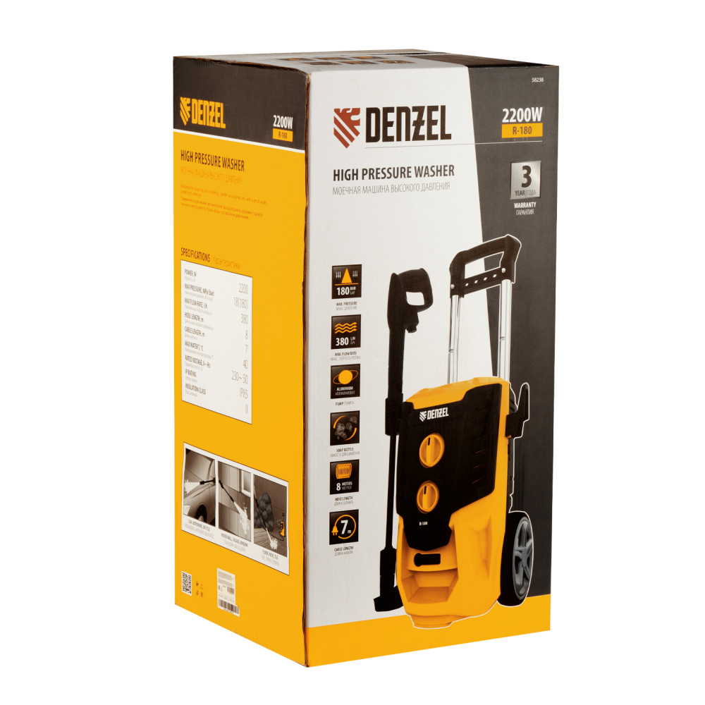 Колесная моечная машина высокого давления Denzel R-180 58238 мощностью 2200 Вт и производительностью 380 л/ч подает струю воды под давлением 180 бар и служит для очищения поверхностей. Позволяет быстро привести в порядок садовые дорожки, удалить пыль и грязь с фасада здания, автомобиля, велосипеда или мотоцикла, отмыть садовый инвентарь. Моечная машина подключается к водопроводу, а при его отсутствии может забирать воду из любого резервуара, работая в режиме самовсасывания. Устройство пригодится для поддержания порядка на загородном участке.