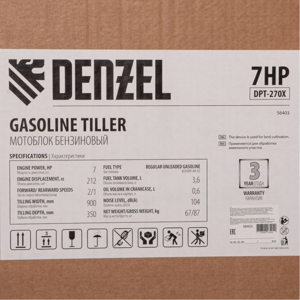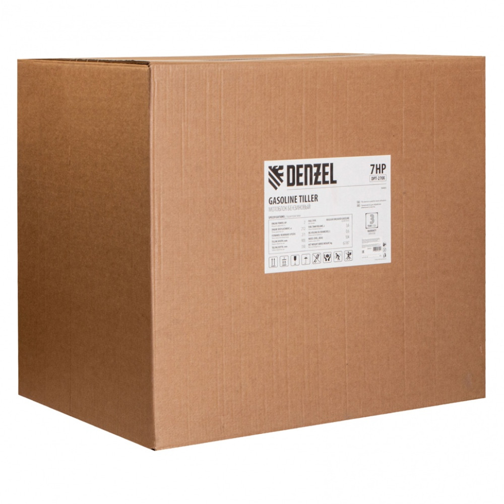 Мотоблок DPT-270X, 7 л.с, дисковое сцепление, ширина 90 см, глубина 35 см, фрез 3 х 4, ВОМ, передачи 2В/1Н Denzel