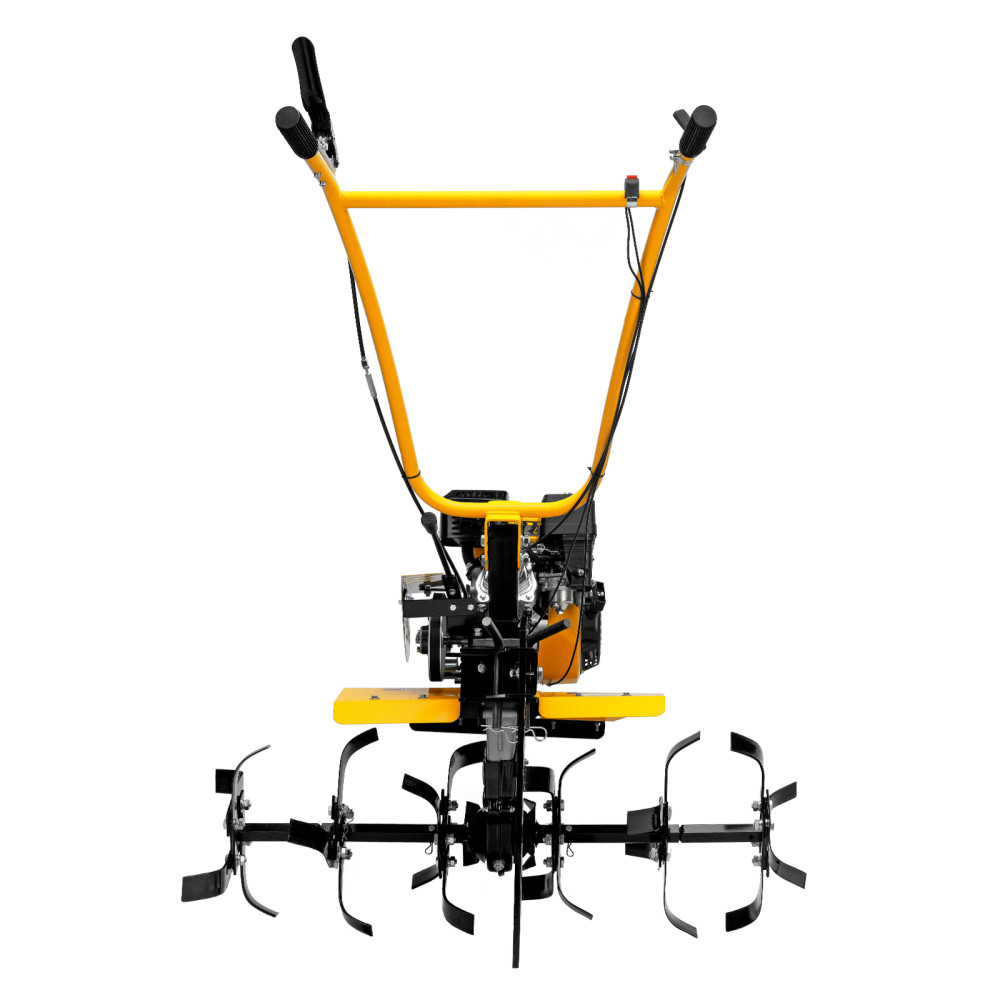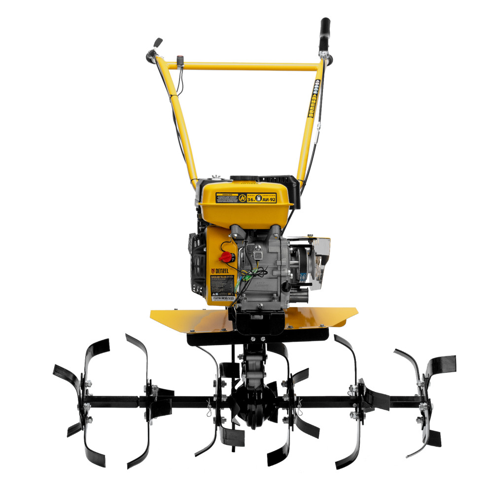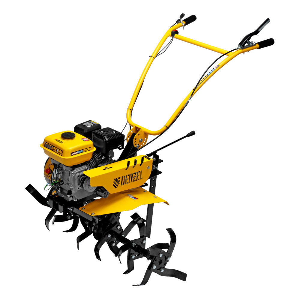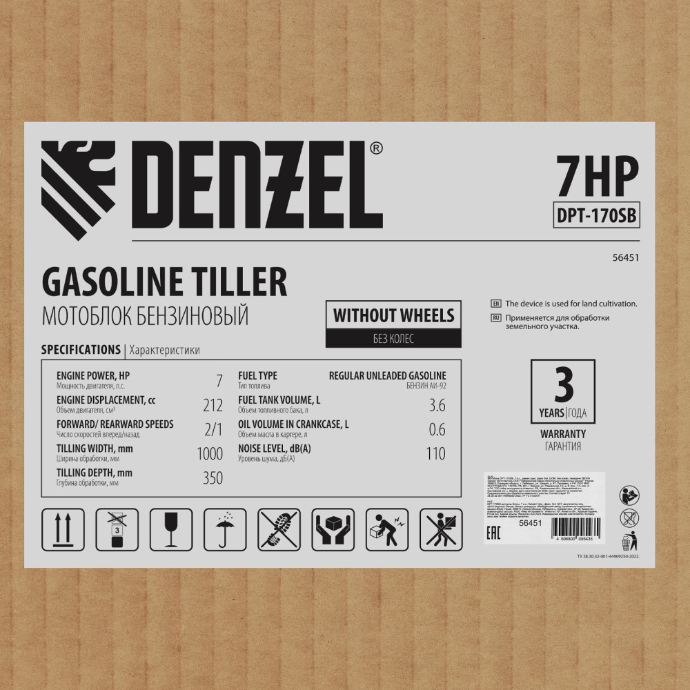 Мотоблок Denzel DPT-170SB 56451 мощностью 7 л. с., с ременным механизмом сцепления, оснащен фрезами 3 х 4, шкивом отбора мощности (ШОМ) и коробкой передач 2В/1Н. Предназначен для выполнения земляных работ: рыхления, вспахивания, прополки и т. д. Разборные фрезы с дополнительными секциями позволяют регулировать ширину обработки до 1 м.