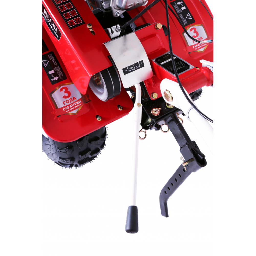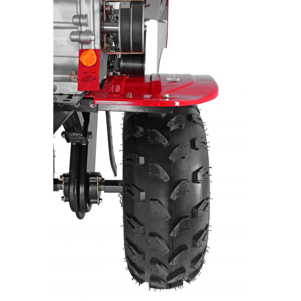 - Машина имеет шестеренчато-цепной редуктор в чугунном корпусе. Активная навеска подключается через ременной привод. Мотоблок имеет 3 передачи: 2 впереди и 1 назад. Задняя передача позволяет легко извлекать фрезы из почвы и повышает маневренность. Предусмотрены широкие крылья для защиты оператора от комьев земли и пыли.