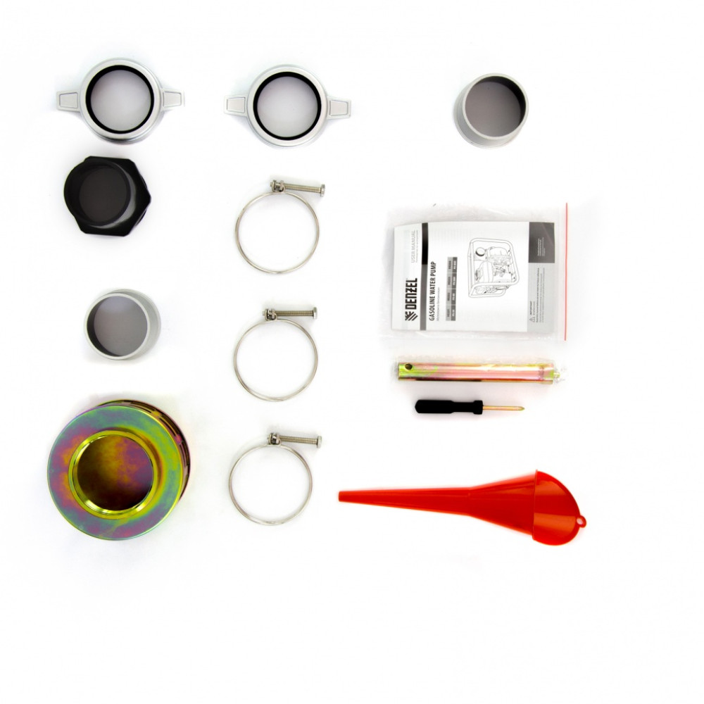 - Необходимые инструменты в комплекте — к мотопомпе прилагаются хомуты и инструменты для подключения шланга.