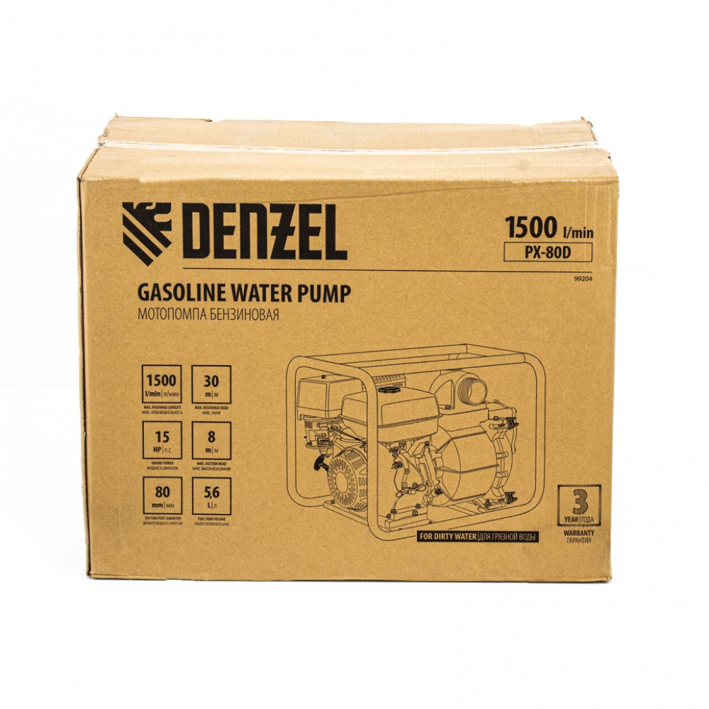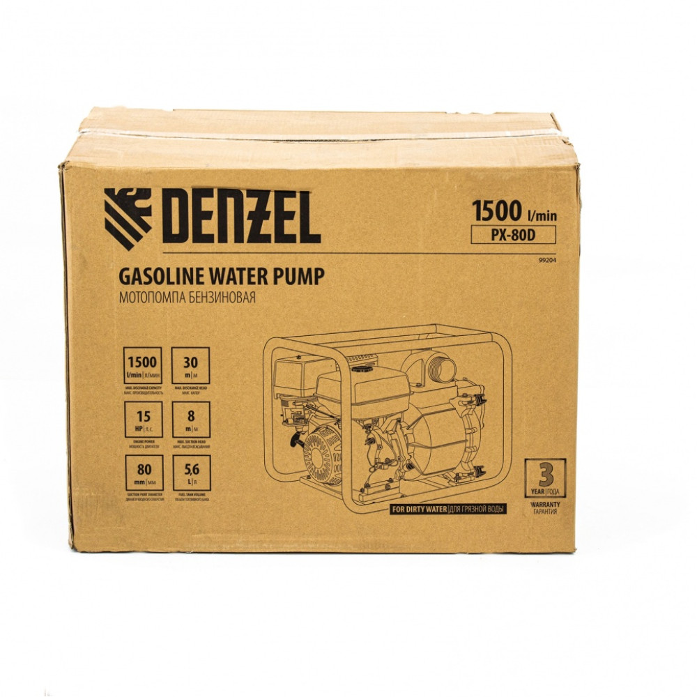Бензиновая мотопомпа Denzel PX-80D 99204 с двигателем мощностью 15 л. с. и штуцерами диаметром 3 дюйма обеспечивает напор 30 м и применяется для откачки грязной воды со скоростью 1500 л/мин из затопленных помещений, а также котлованов, траншей, погребов, колодцев глубиной до 8 м. Оптимальна для проведения земляных работ, т. к. может работать с грязной водой, содержащей фракции размером до 28 мм. Используется также для подачи чистой воды на стройку, небольшое предприятие, на дачный участок и в систему полива.