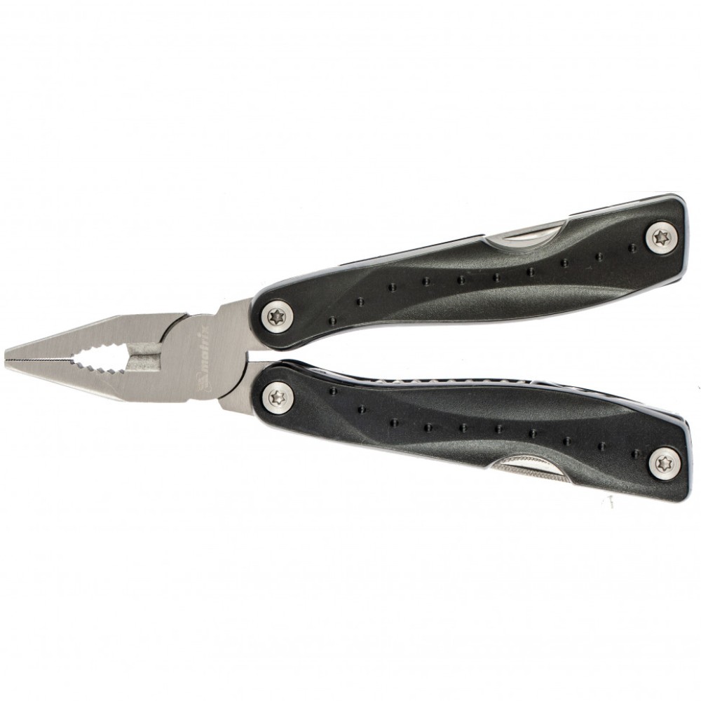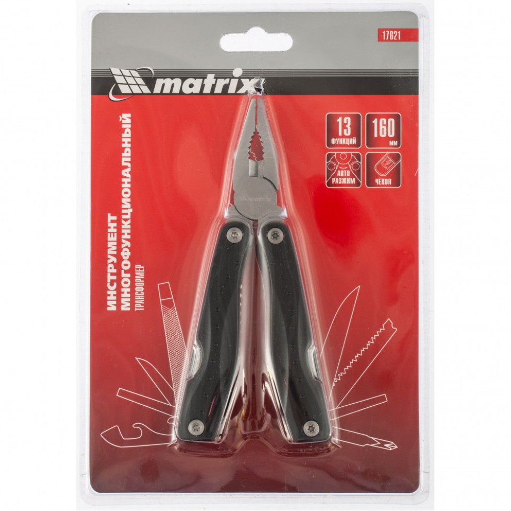 Трансформер Matrix 17621 — это мультитул длиной 160 мм с 13 функциями и авторазжимом, поставляется с чехлом. Его можно использовать в гараже — он включает длинногубцы с кусачками и захватом полукруглых предметов, а также отвертки. Инструмент пригодится в походе, на рыбалке или охоте, поскольку имеет в составе нож, пилу, открывалку и консервный нож. Благодаря пилке для ногтей мультитул будет полезен в быту.
