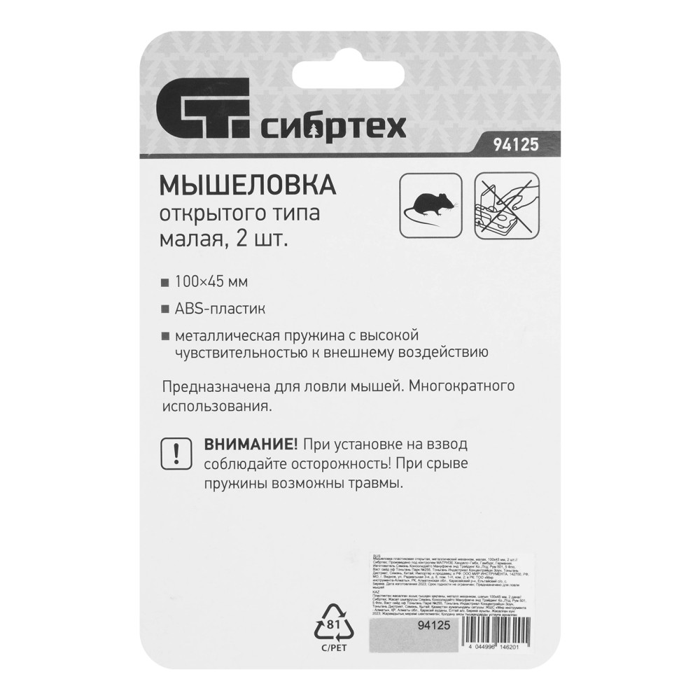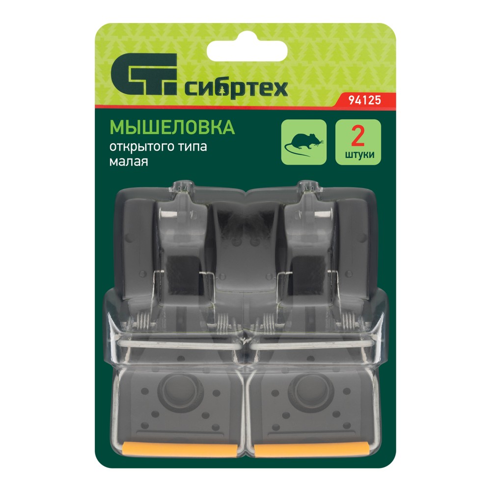 Малая пластиковая мышеловка Сибртех 94125 открытого типа, с металлическим механизмом, размером 100 х 45 мм, входит в комплект из 2 изделий, предназначенных для поимки грызунов. Мощная стальная пружина обеспечивает гарантированное уничтожение вредителей.ПреимуществаВысокая чувствительность к нажатию — исключена вероятность того, что мышь украдет приманку, а механизм не сработает.Возможность многократного использования — пластиковый корпус легко моется и не впитывает запахи.Удобная комплектация — в наборе 2 мышеловки, что позволяет ускорить борьбу с вредителями.