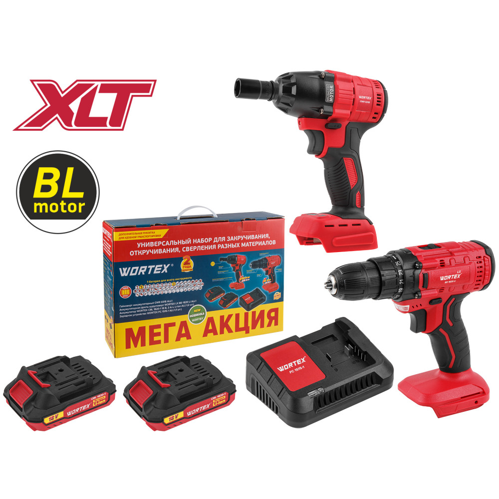 Набор включает в себя аккум. дрель-шуруповерт WORTEX LX BD 1820 Li, аккум. ударный гайковерт WORTEX CWR 0318, 2 аккумулятора WORTEX CBL 1820-1, 2 Ач, зарядное устройство WORTEX FC 1515-1, 2 А.