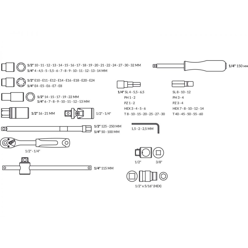 Головка торцевая 1/4": 4, 4.5, 5, 5.5, 6, 7, 8, 9, 10, 11, 12, 13, 14 мм,