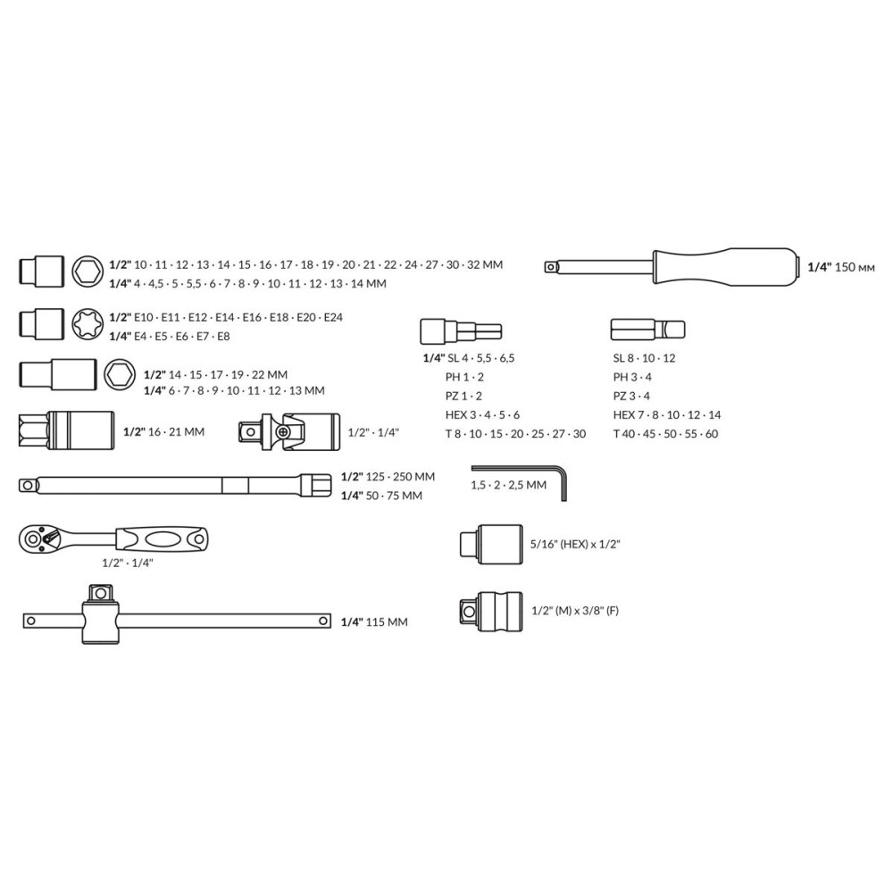Головка торцевая 1/4": 4, 4.5, 5, 5.5, 6, 7, 8, 9, 10, 11, 12, 13, 14 мм,