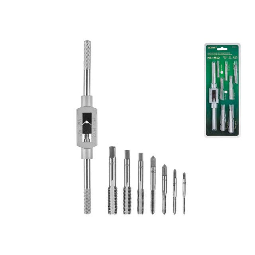 метчики: 7 шт. М3 x 0,5 мм, М4 x 0,7 мм, М5 x 0,8 мм, М6 x 1 мм, М8 x 1,25 мм, М10 x 1,5 мм, М12 x 1,75 мм,