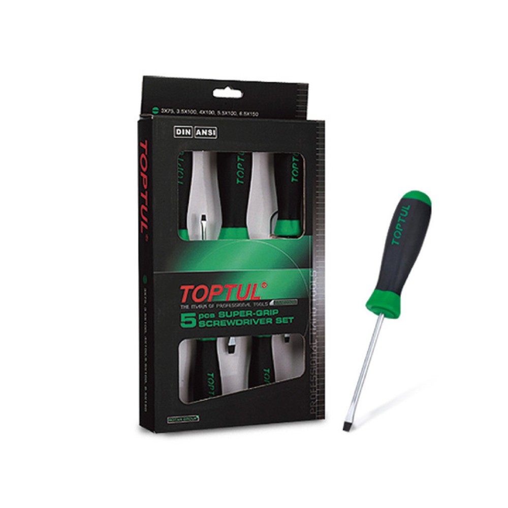 Набор отверток шлицевых TOPTUL 5 предметов (GAAE0503) используется квалифицированными специалистами различных сфер промышленности. Цельнозакаленный стержень отверток изготовлен из конструкционной легированной стали. Двухкомпонентная рукоятка гарантирует удобство в работе и предотвращает проскальзывание инструмента в руке.