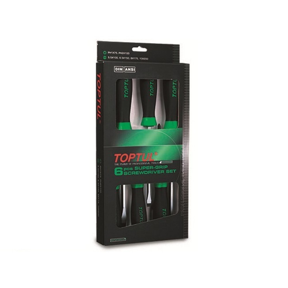"Набор отверток TOPTUL 6 предметов (GAAE0608) используется квалифицированными специалистами различных сфер промышленности. Цельнозакаленный стержень отверток изготовлен из конструкционной легированной стали и оснащен магнитным наконечником. Двухкомпонентная рукоятка: термопластичный каучук и полипропилена гарантирует удобство в работе и предотвращает проскальзывание инструмента в руке. Набор включает 4 плоскошлицевых отвертки и две с шлицем РН.