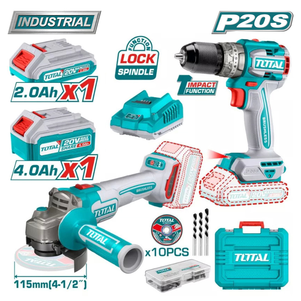 - TOTAL TCKLI20273 - набор аккумуляторного инструмента для интенсивного использования (industrial), включающий болгарку и ударную дрель-шуруповерт