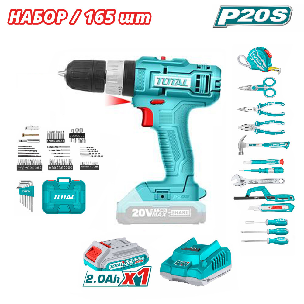 - TOTAL THKTHP11652 - отличный набор инструментов, включающий аккумуляторную дрель-шуруповерт TIDLI20035 с ударной функцией сверления, комплект ручных инструментов и оснастки.