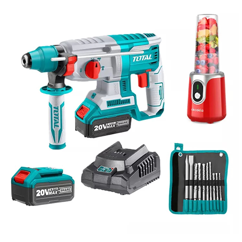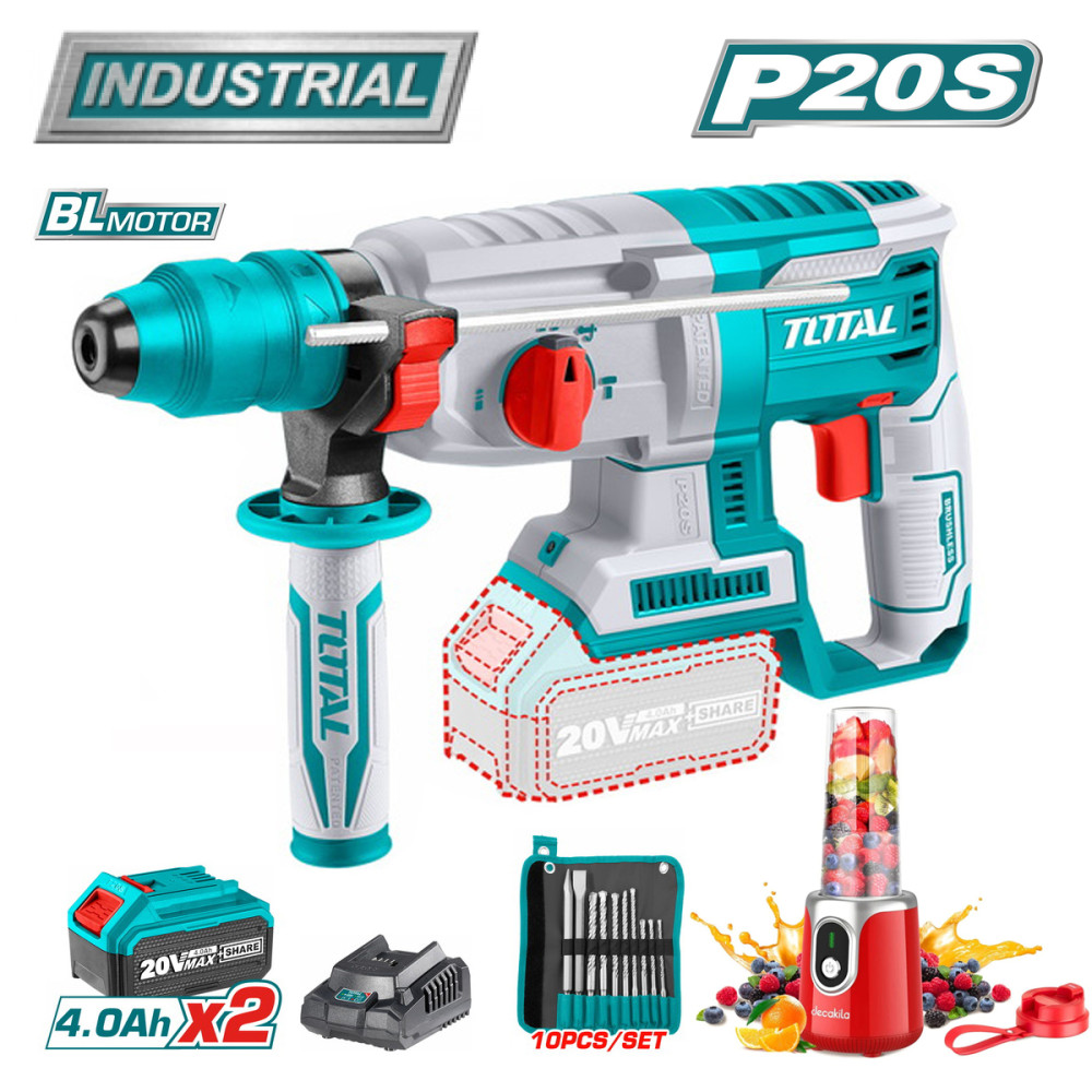 - Перфоратор входит в линейку инструментов TOTAL P20S и совместим со всеми аккумуляторами TOTAL 20В - TFBLI20011, TFBLI2002, TFBLI2053