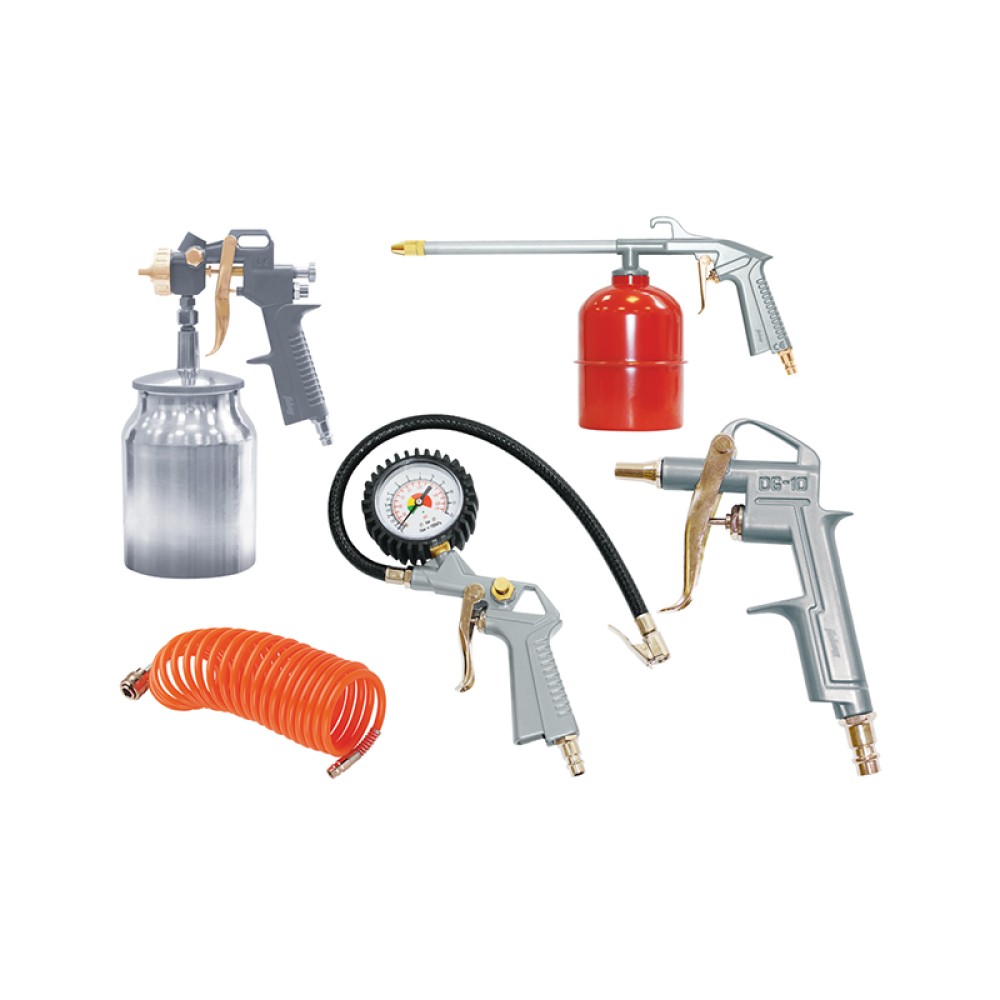 В комплект набора входят: краскораспылитель с нижним бачком объемом 1,0 л, пневмопистолет для вязких жидкостей с бачком 0,85 л, пневмопистолет для продувки, пневмопистолет для накачки шин с манометром, спиральный шланг длиной 5 м.