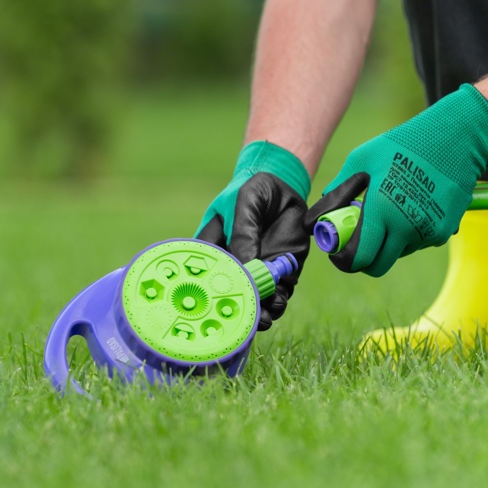 Распылитель-дождеватель Palisad 65463 с 8 режимами, на подставке, оптимален для установки на участке среднего размера. Максимальная площадь полива составляет 150 м², максимальный угол полива — 360°, расход воды не превышает 8 л/мин. С помощью устройства можно орошать растения на участках различной формы в саду и на огороде.ПреимуществаШирокий выбор режимов — двойной круг, треугольник, прямоугольник, квадрат, полукруг, сектор, тонкая струя и туман.Долгий срок службы — распылитель-дождеватель выполнен из ударопрочного ABS-пластика.Эффективное использование на разных участках — дальность полива можно регулировать в диапазоне 3-12 м.Дополнительные возможности — для полива высоких кустов и деревьев распылитель можно подвешивать за специальную петлю.Устойчивая подставка — устройство можно ставить даже на неровные поверхности.Универсальность — распылитель-дождеватель совместим со всеми элементами полива Palisad.