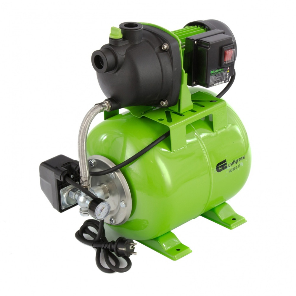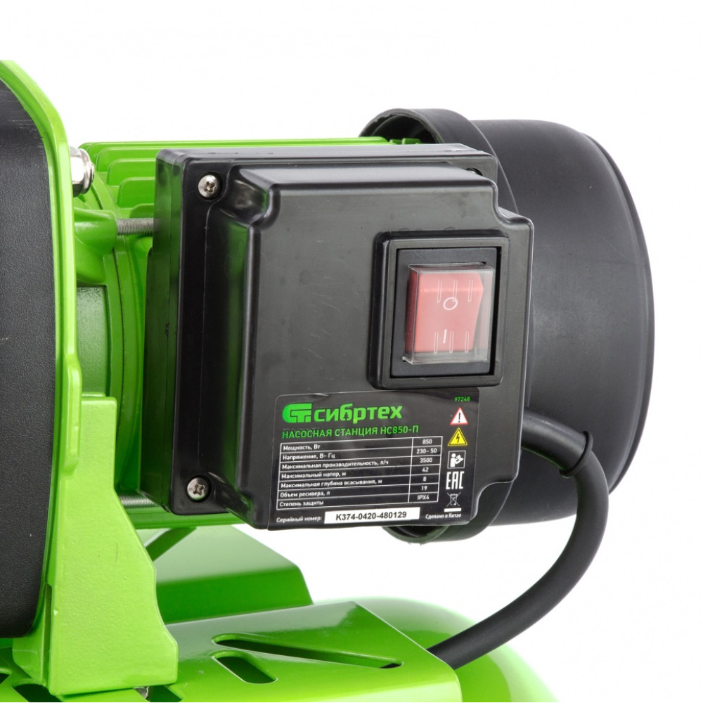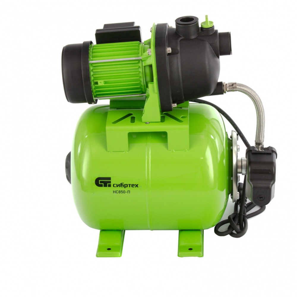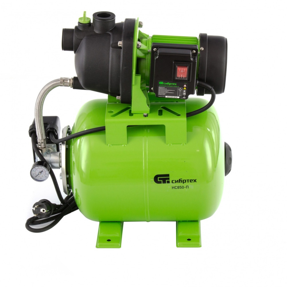 Насосная станция Сибртех НС850-П 97248 мощностью 850 Вт, с ресивером на 19 л, работает со скоростью 3500 л/ч и обеспечивает напор до 42 м. Используется для обеспечения подачи воды в загородных домах, поддержания давления в системе водоснабжения квартир. Однофазный мотор обеспечивает производительность на уровне 58 л/мин под давлением не более 2,8 бар.