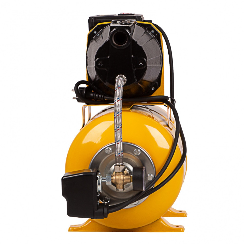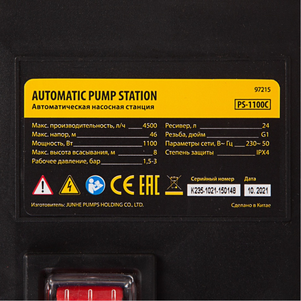 Насосная станция Denzel PS1100C 97215 мощностью 1100 Вт и производительностью 4500 л/ч, с корпусом из чугуна и ресивером на 24 л, способна перекачивать чистую воду с глубины до 8 м и обеспечивает напор до 46 м. Подходит для подачи воды из колодцев и резервуаров в несколько точек разбора одновременно — на кухню, в баню, душ и систему полива. Вместительный ресивер накапливает воду, снижая количество включений и нагрузку на двигатель, а также обеспечивая запас воды на случай отключения электричества. Станция работает в автоматическом режиме и не требует постоянного контроля пользователя.