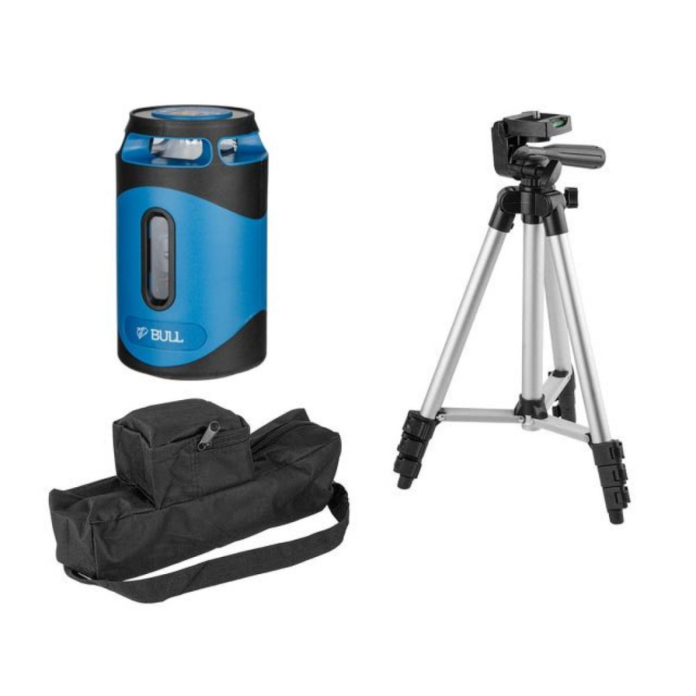 Компактный нивелир отличается зеленым диодом, позволяющим работать в условиях высокой освещенности. Лазерный нивелир BULL оснащен немецкими LD лазерами компании OSRAM. Инструмент имеет проекцию креста. Боковые грани корпуса прорезинены, что выполняет противоударную функцию. Кроме того у инструмента есть возможность фиксации лучей. Для удобства эксплуатации предусмотрена регулировка яркости луча. Поставляется в комплекте со штативом 1м.