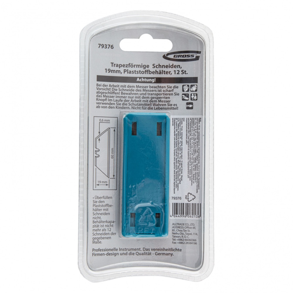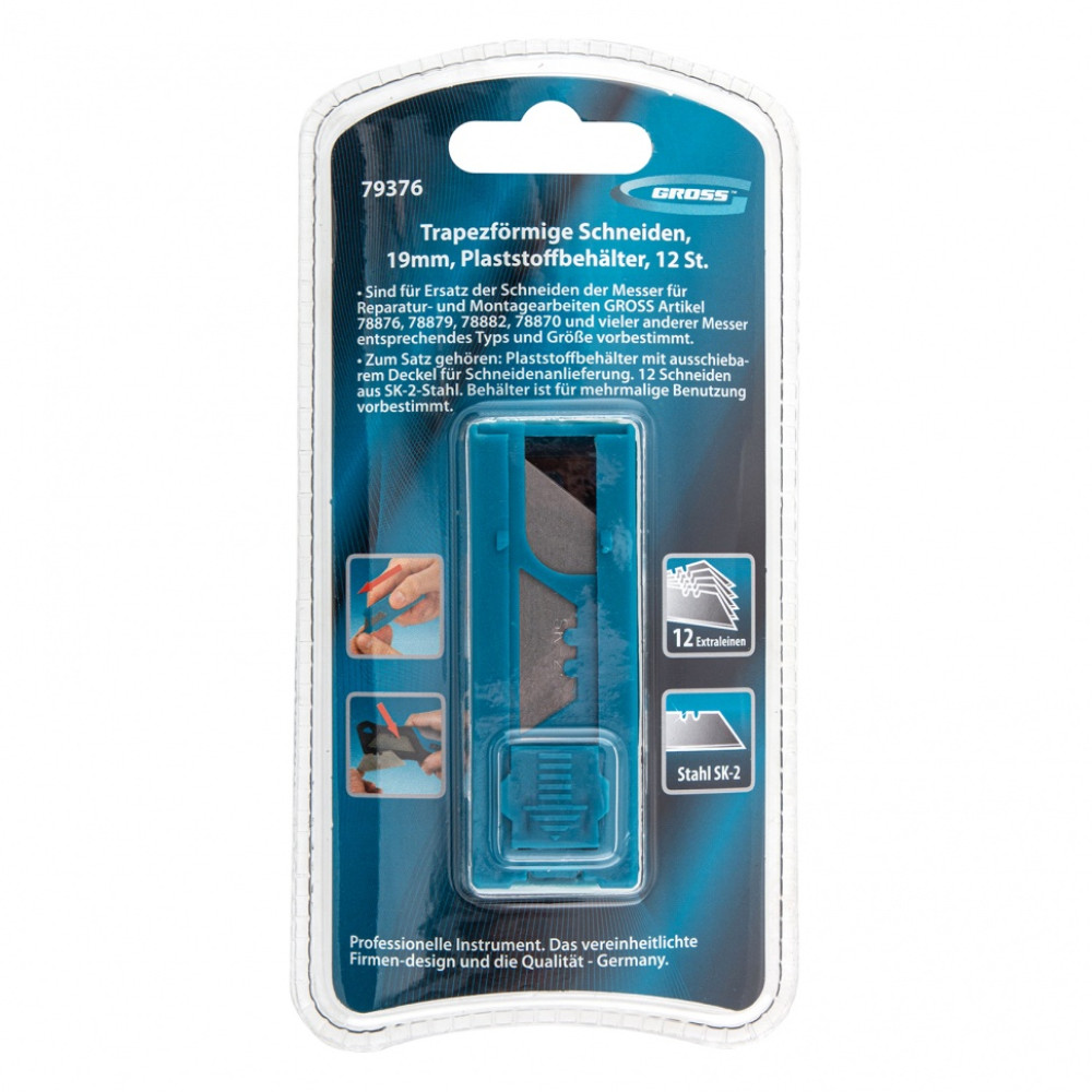 Трапециевидные лезвия Gross 79376 шириной 19 мм и длиной 61 мм, 12 шт. в пластиковом пенале, — сменные элементы для монтажных ножей Gross соответствующего типоразмера, кроме арт. 78873 и 78885. Они предназначены для резки бумаги, картона, кожи, линолеума. Пригодятся во время ремонта, отделочных работ, а также могут использоваться для творчества.