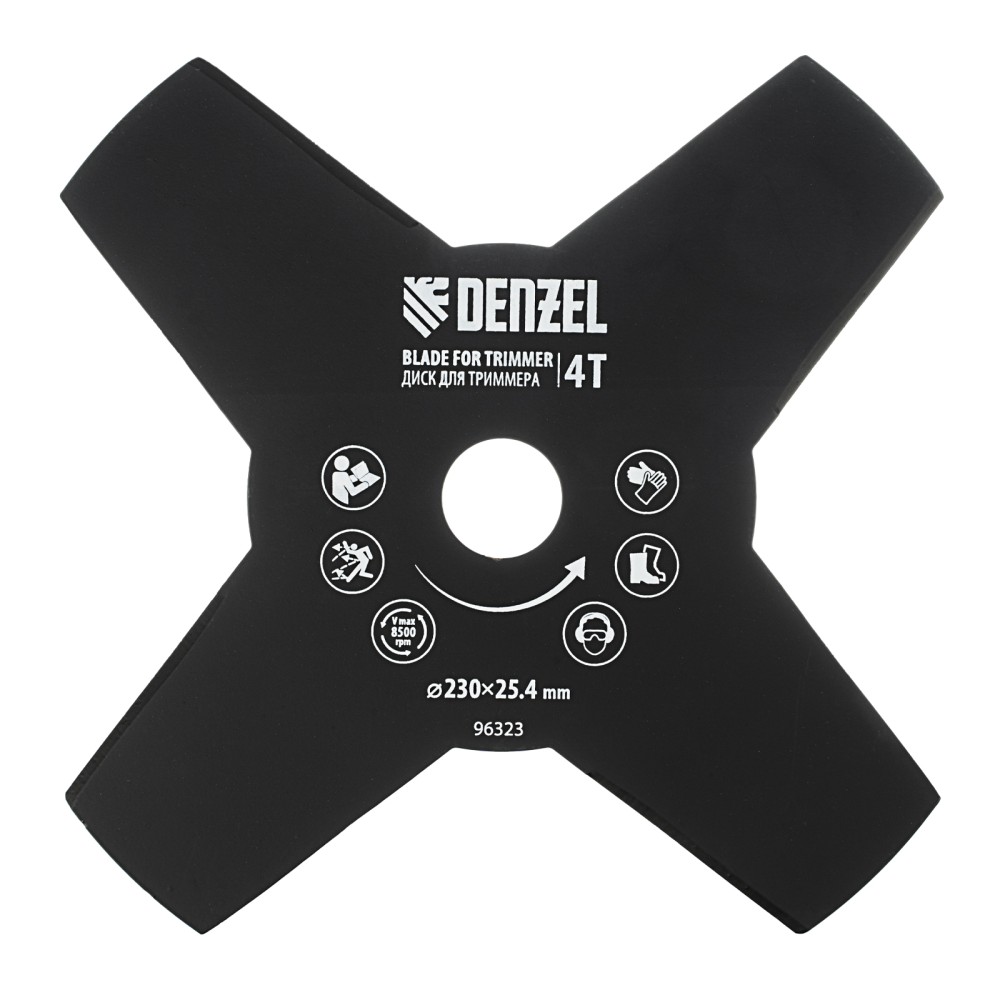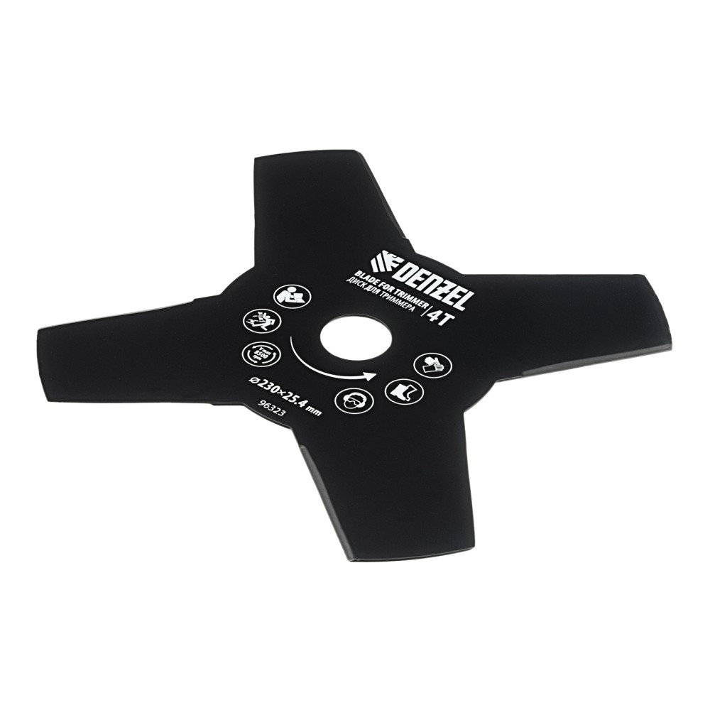 Диск для триммера Denzel 96323 размером 230 х 25,4 мм, толщиной 1,6 мм, с 4 лезвиями, предназначен для скашивания травы различных типов, в том числе с жесткими стеблями (полыни, крапивы, лебеды). Рекомендован к использованию со всеми типами бензиновых триммеров, а также с электрическими триммерами мощностью не менее 1,0 кВт, например Denzel 96611 и 96612.ПреимуществаПрочность и долговечность — диск изготовлен из стали и обработан порошковой краской для защиты от коррозии.4 лезвия — диск аккуратно срезает траву, делая более удобной работу по заготовке сена.Высокая производительность — лезвия с режущими кромками большой длины заточены с обеих сторон.