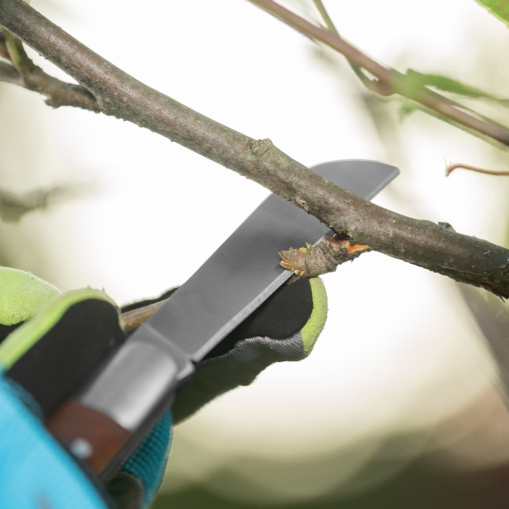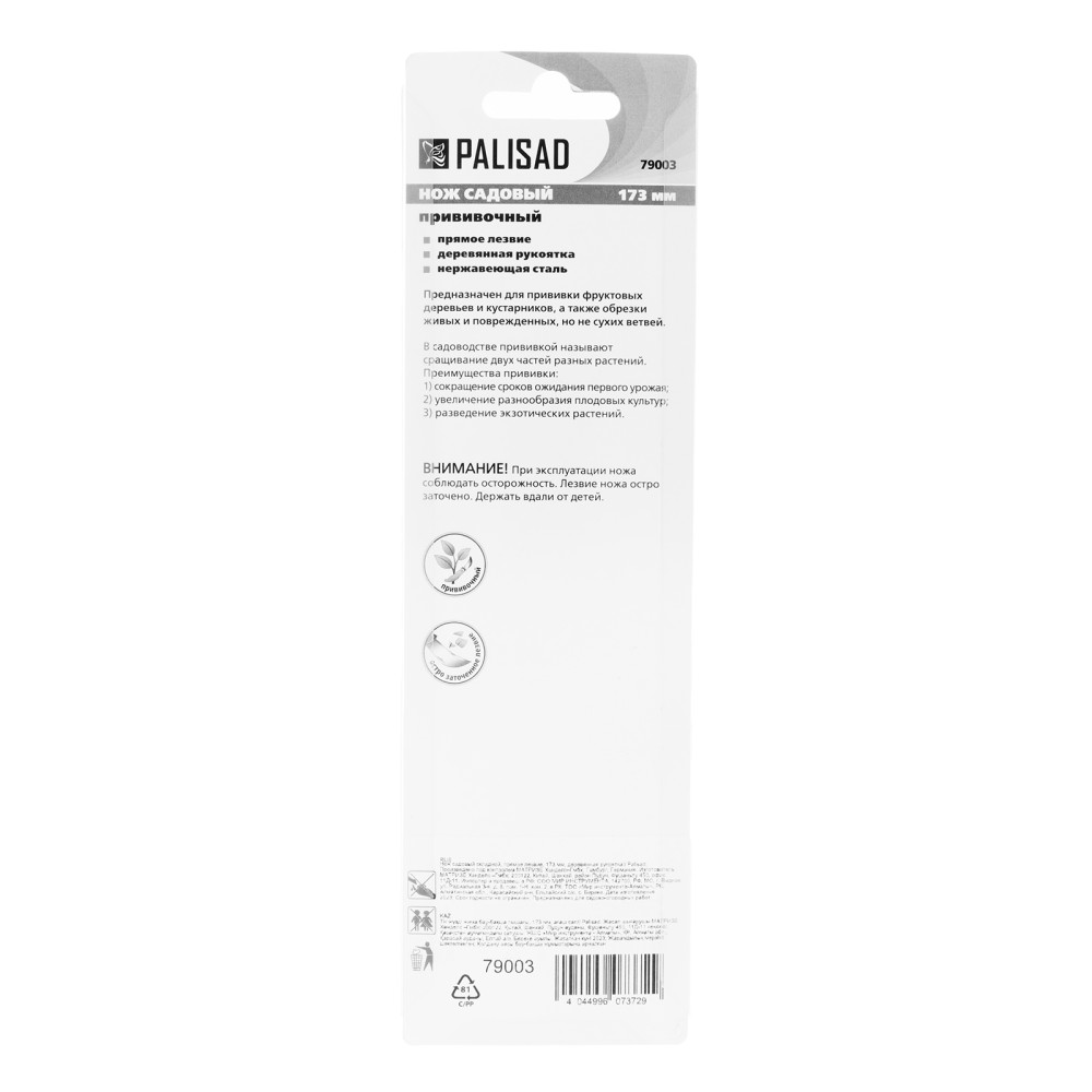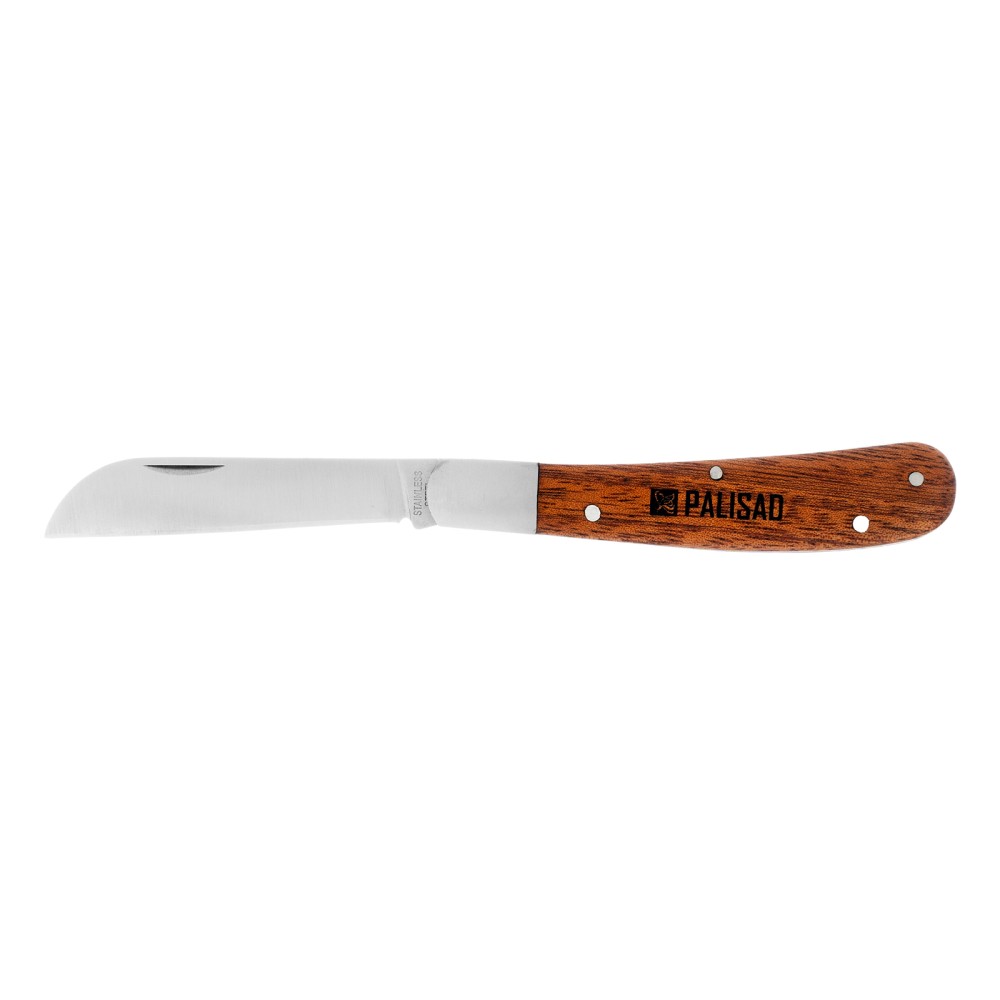 Садовый складной нож Palisad 79003 длиной 173 мм, с прямым лезвием и деревянной рукояткой, предназначен для удаления сучьев, нарезки черенков, срезания шипов, зачистки срезов и т.д. Складной нож удобен и безопасен в хранении и транспортировке. Инструмент будет полезен владельцам дачных участков. Во избежание преждевременного износа лезвия рекомендуется протирать его салфеткой и смазывать маслом после каждого применения.ПреимуществаПрочность и долговечность — лезвие изготовлено из нержавеющей стали, закаленной до твердости 48-50 HRC.Высокий ресурс — остро заточенная кромка долго сохраняет режущие свойства.Устойчивость к разрушению — рукоятка пропитана маслом для защиты от воздействия влаги и УФ-лучей.Эргономичность — благодаря выемке на лезвии нож легко открывается.Комфортная работа — рукоятка из древесины ротанговой пальмы приятна на ощупь.