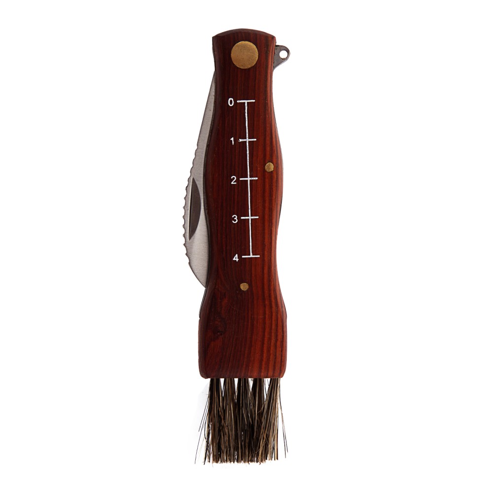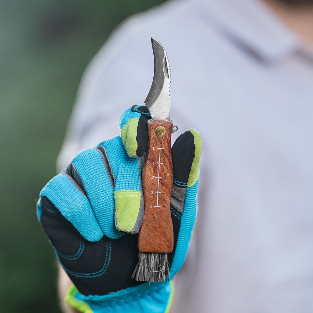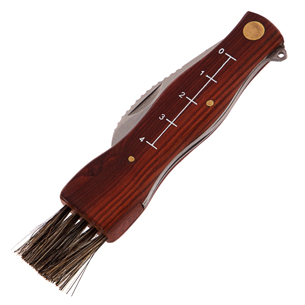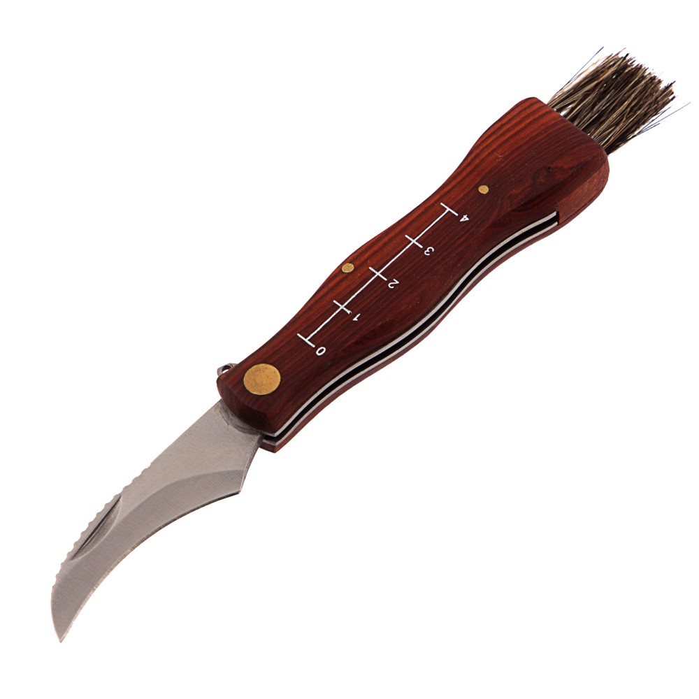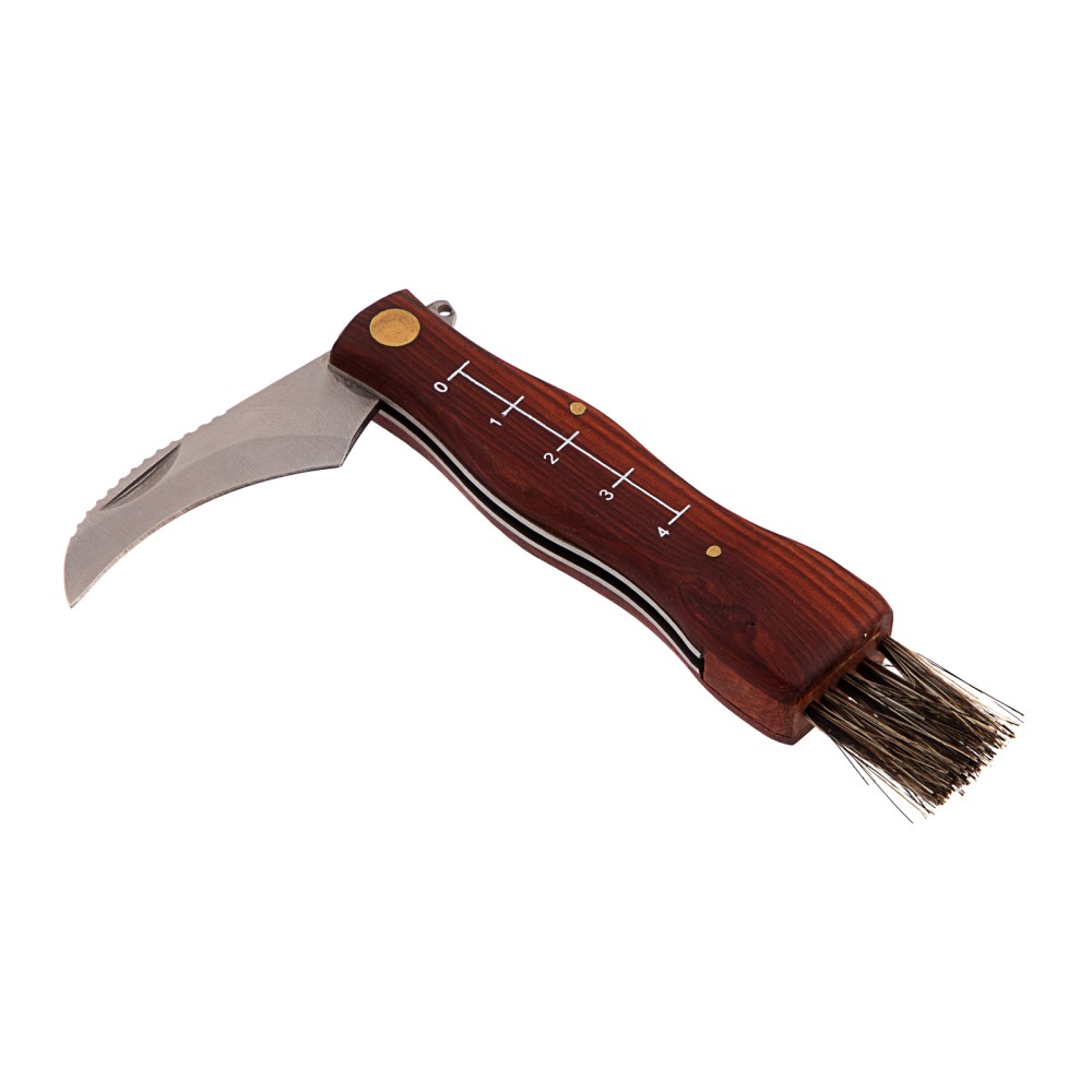 Складной нож Palisad 79004 длиной 145 мм с деревянной рукояткой пригодится грибникам для удобного сбора грибов. Складная конструкция позволяет безопасно транспортировать нож, при этом он легко поместится в карман. Лезвие серповидной формы с остро заточенной режущей кромкой легко срезает даже толстые ножки грибов.ПреимуществаДолговечность и надежность ножа достигается благодаря лезвию из нержавеющей стали, закаленной до твердости 48-50 HRC.Нож оснащен кисточкой из натуральной щетины для очищения шляпок грибов от мелких листьев, хвои и другого мусора.Специальные зазубрины на верхней кромке лезвия помогают очистить ножки грибов от земли и грязи.Выемка на лезвии позволяет легко открывать нож.Шкала на рукоятке помогает измерить длину грибов.Рукоятка из древесины пропитана маслом, защищающим ее от рассыхания и разбухания под воздействием влаги.