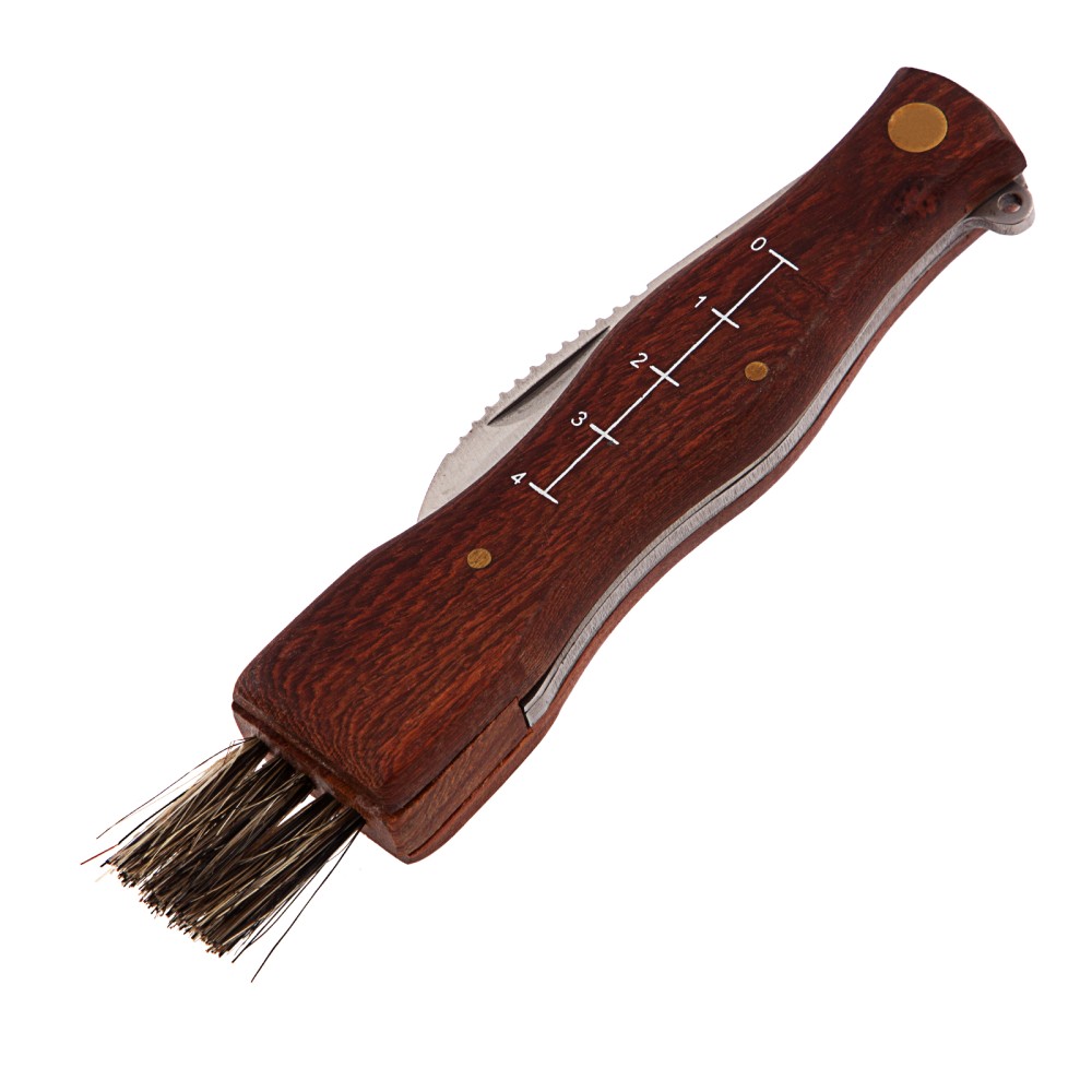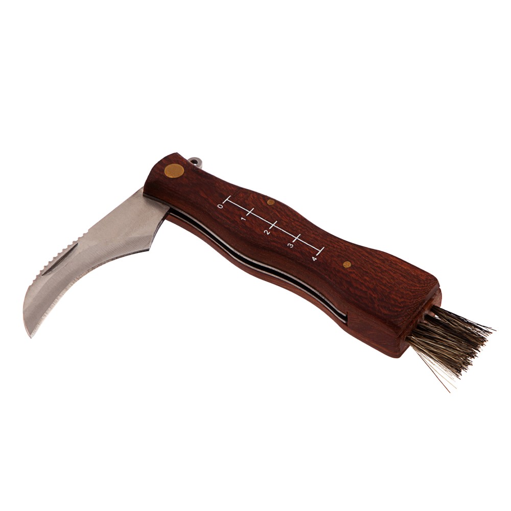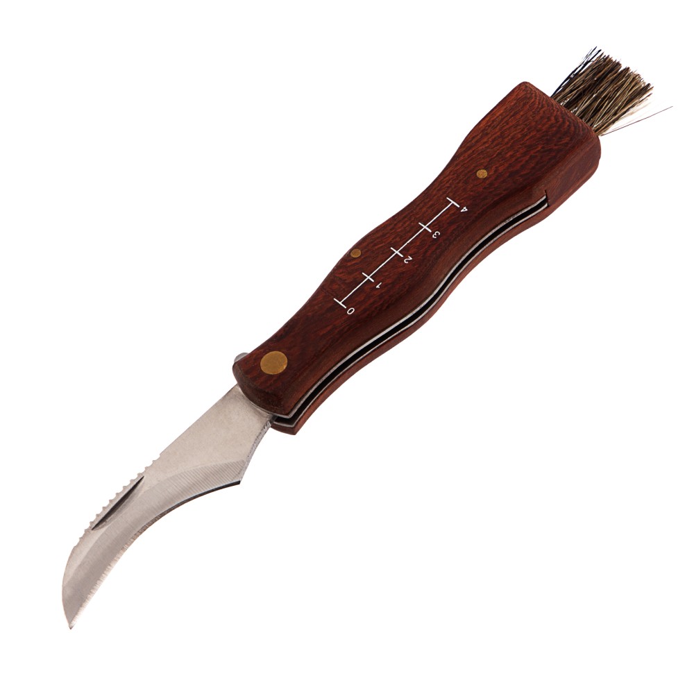 Складной нож Palisad 79005 длиной 185 мм с деревянной рукояткой пригодится грибникам для удобного сбора грибов. Складная конструкция позволяет безопасно транспортировать нож, при этом он легко поместится в карман. Лезвие серповидной формы с остро заточенной режущей кромкой легко срезает даже толстые ножки грибов.ПреимуществаДолговечность и надежность ножа достигается благодаря лезвию из нержавеющей стали, закаленной до твердости 48-50 HRC.Нож оснащен кисточкой из натуральной щетины для очищения шляпок грибов от мелких листьев, хвои и другого мусора.Специальные зазубрины на верхней кромке лезвия помогают очистить ножки грибов от земли и грязи.Выемка на лезвии позволяет легко открывать нож.Шкала на рукоятке помогает измерить длину грибов.Рукоятка из древесины ротанговой пальмы пропитана маслом, защищающим ее от рассыхания и разбухания под воздействием влаги.