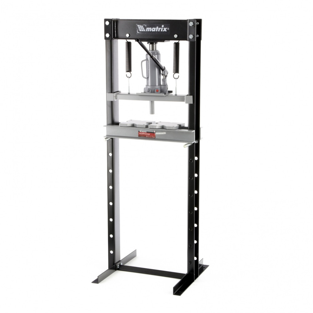 Гидравлический пресс Matrix 523105 размером 1360 х 500 х 510 мм, воздействующий на детали с усилием 12 т, поставляется комплектом из 2 частей. Его используют для запрессовки и выпрессовки различных деталей, необходимых для ремонта автомобилей. Изготовлен из толстого прочного металла и имеет простую разборную конструкцию из верхней и нижней балок, стоек, станин и гидравлического бутылочного домкрата. Пресс подойдет для самостоятельного использования в гараже.