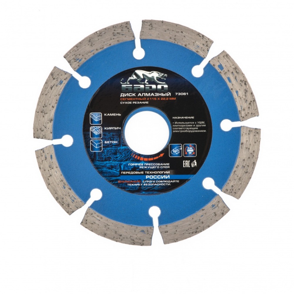 Сегментный алмазный диск Барс ф115х22,2 мм 73061 для сухого резания устанавливается в качестве оснастки на УШМ и штроборезы с соответствующим посадочным диаметром. Он пригодится домашним мастерам и профессионалам для сухой резки камня, кирпича, бетона и гранита, позволит быстро справиться с большим объемом работ.