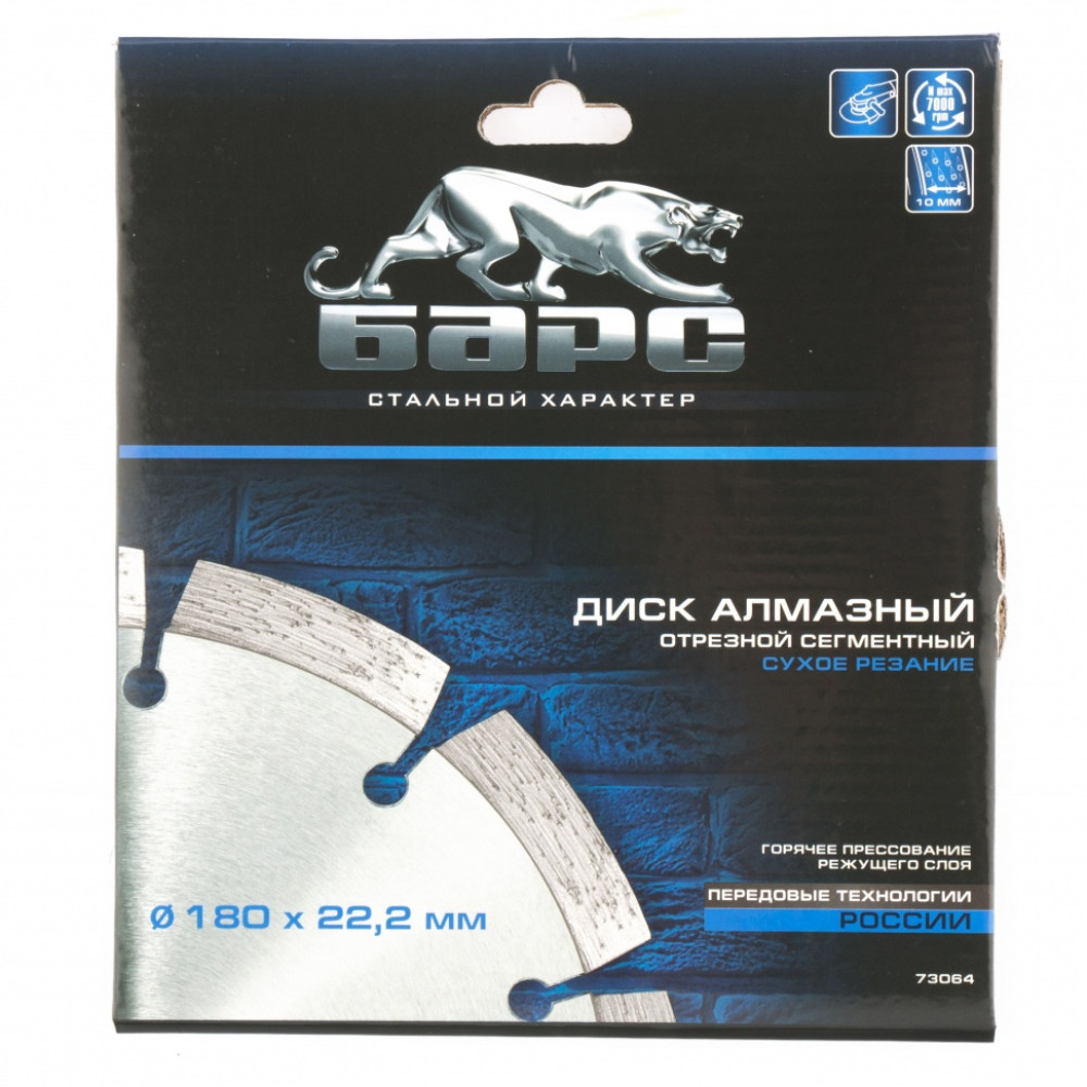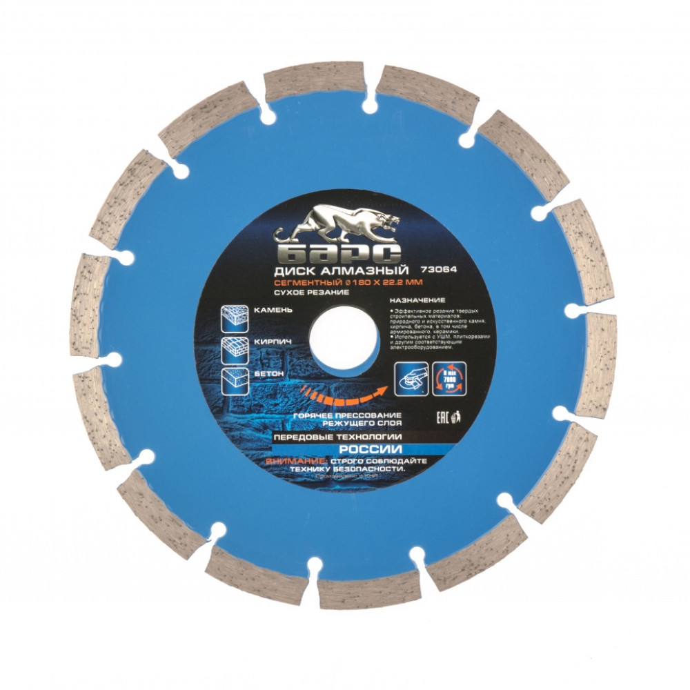 Сегментный алмазный диск Барс ф180х22,2 мм 73064 для сухого резания устанавливается в качестве оснастки на УШМ и штроборезы с соответствующим посадочным диаметром. Он пригодится домашним мастерам и профессионалам для сухой резки камня, кирпича, бетона и гранита, позволит быстро справиться с большим объемом работ.