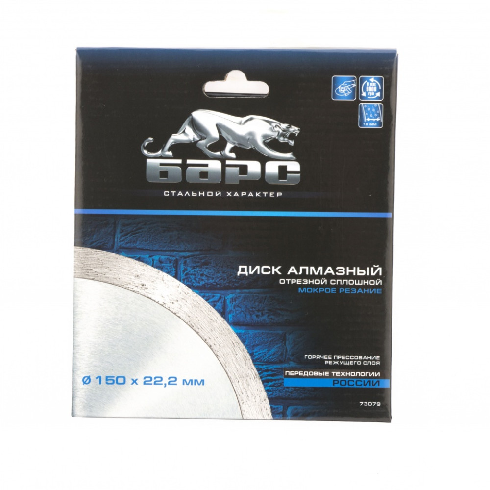 Сплошной алмазный диск Барс ф150х22,2 мм 73079 применяется совместно с УШМ или плиткорезами для мокрого резания твердых материалов: гранит и керамогранит, кафель, плитка, мрамор, натуральный и искусственный камень. Сплошная форма диска позволяет добиться ровного среза без трещин и сколов. Водяное охлаждение предотвращает перегрев диска, а также повышает его ресурс.