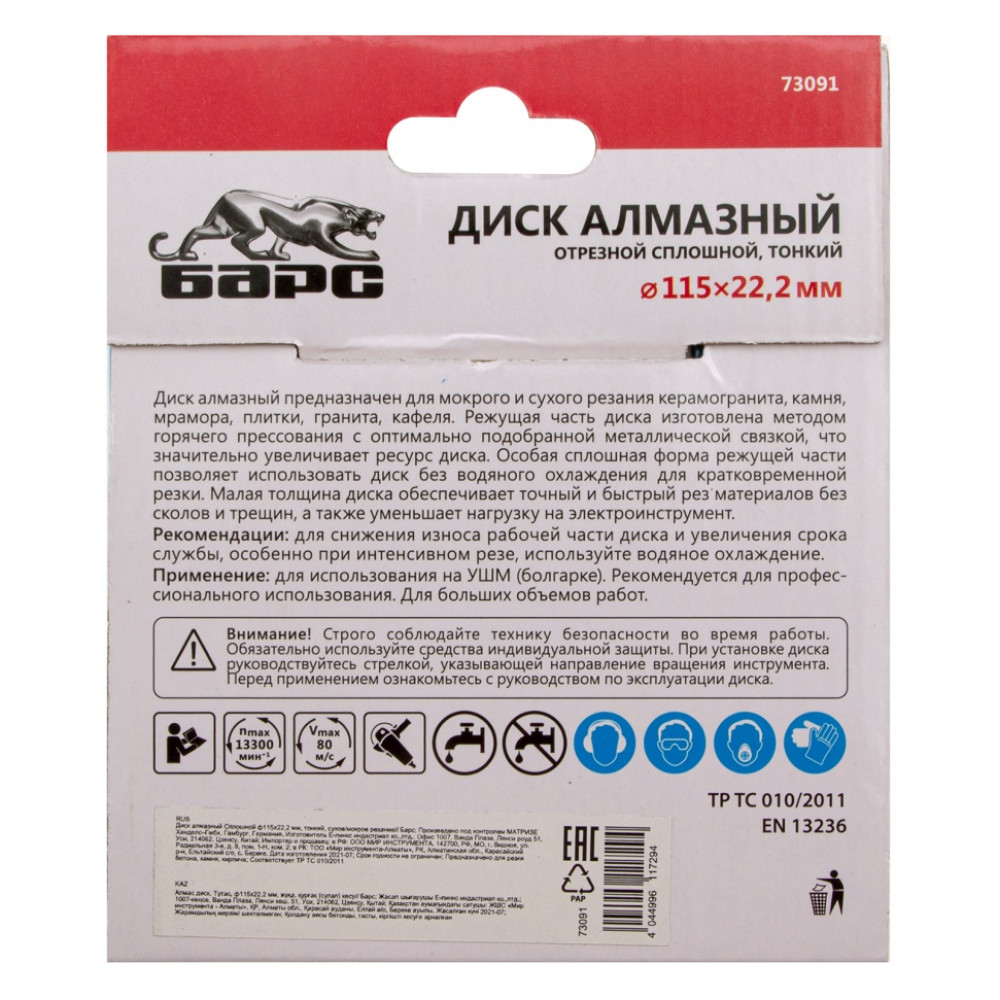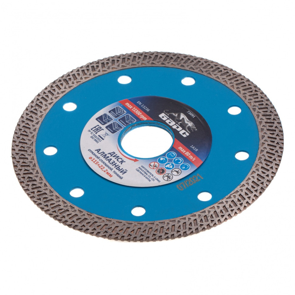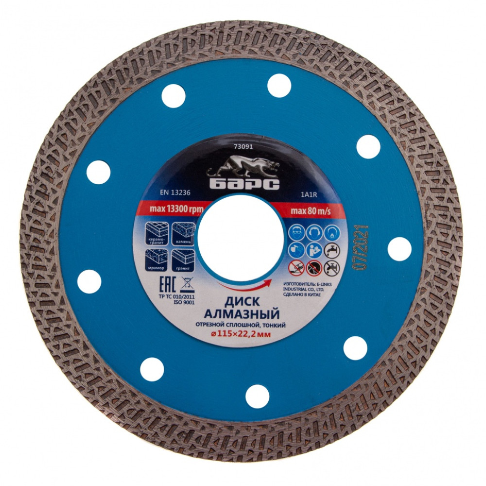 Тонкий сплошной алмазный диск Барс ф115х22,2 мм 73091 с особой формой рабочей части применяется как для сухого, так и мокрого резания гранита и керамогранита, плитки, кафеля, мрамора, искусственного и натурального камня с помощью УШМ или плиткореза. Уменьшенная толщина диска позволяет снизить нагрузку на рабочий инструмент при резке керамогранита и других твердых материалов. Диск предназначен для профессиональной эксплуатации. Использование водяного охлаждения увеличивает ресурс диска и снижает вероятность получения сколов.