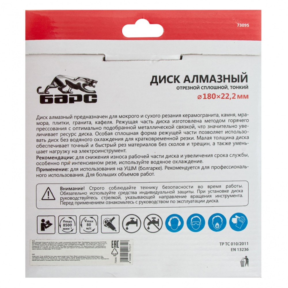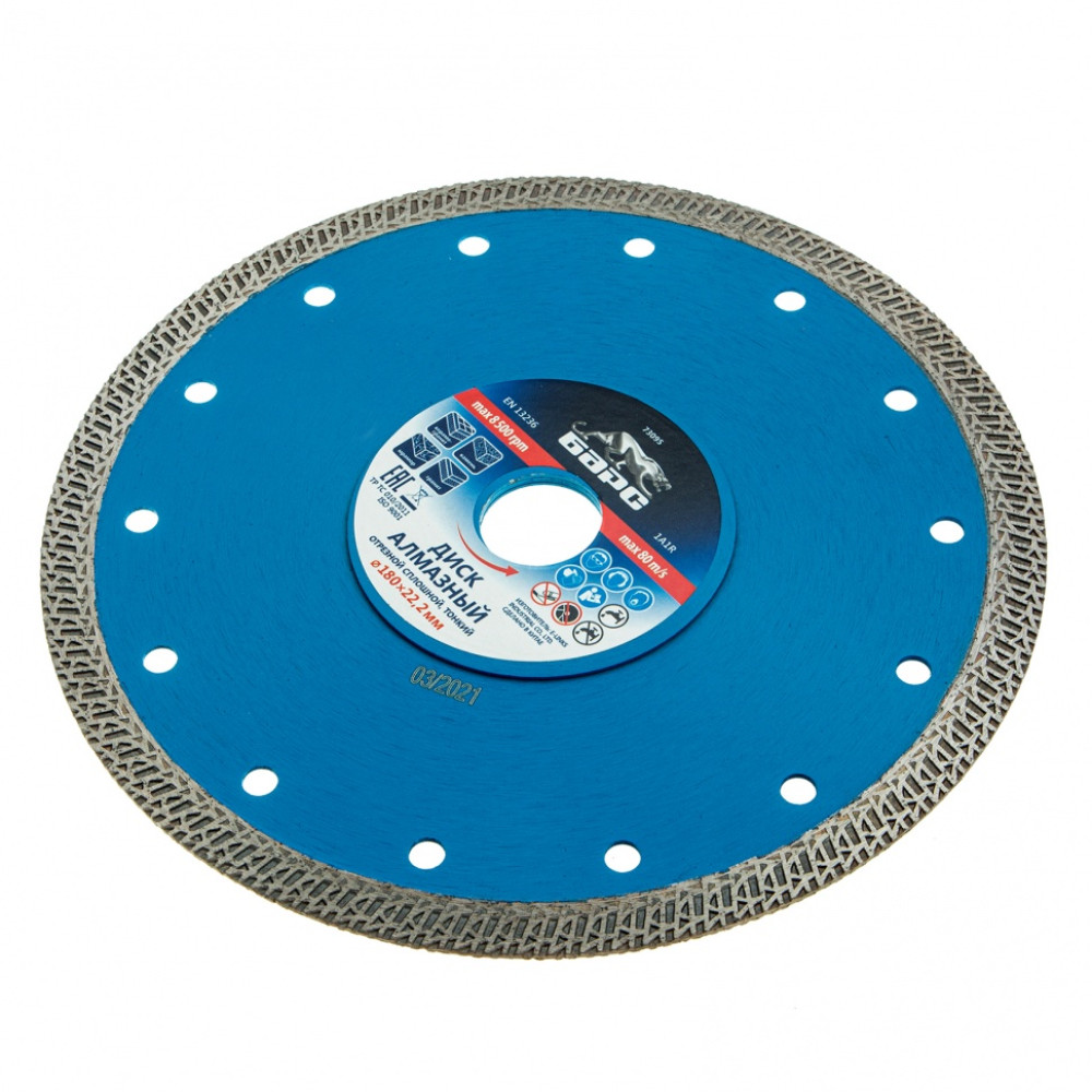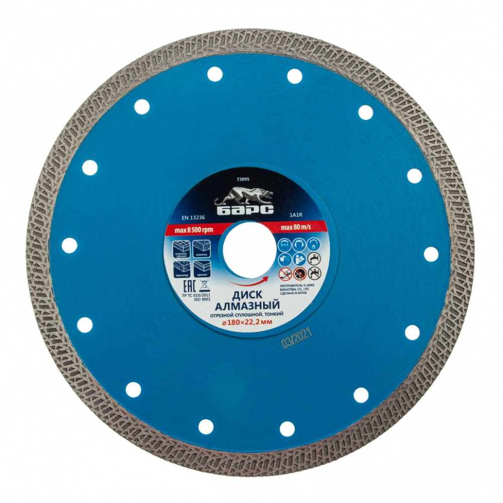 Тонкий сплошной алмазный диск Барс ф180х22,2 мм 73095 с особой формой рабочей части применяется как для сухого, так и мокрого резания гранита и керамогранита, плитки, кафеля, мрамора, искусственного и натурального камня с помощью УШМ или плиткореза. Уменьшенная толщина диска позволяет снизить нагрузку на рабочий инструмент при резке керамогранита и других твердых материалов. Диск предназначен для профессиональной эксплуатации. Использование водяного охлаждения увеличивает ресурс диска и снижает вероятность получения сколов.