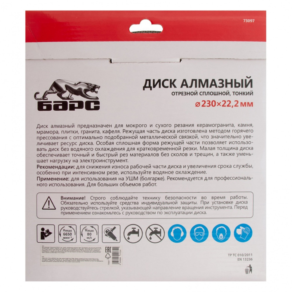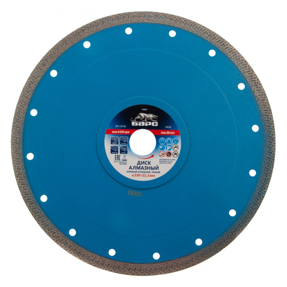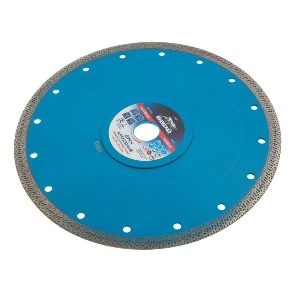 Тонкий сплошной алмазный диск Барс ф230х22,2 мм 73097 с особой формой рабочей части применяется как для сухого, так и мокрого резания гранита и керамогранита, плитки, кафеля, мрамора, искусственного и натурального камня с помощью УШМ или плиткореза. Уменьшенная толщина диска позволяет снизить нагрузку на рабочий инструмент при резке керамогранита и других твердых материалов. Диск предназначен для профессиональной эксплуатации. Использование водяного охлаждения увеличивает ресурс диска и снижает вероятность получения сколов.