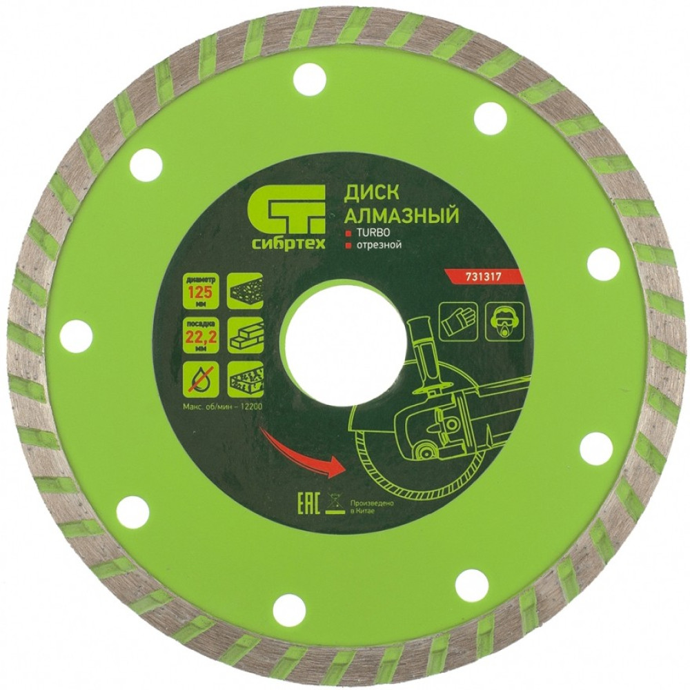 Алмазный отрезной диск Сибртех Turbo 731317 для сухой резки, 125 х 22,2 мм, устанавливается на углошлифовальные машинки и предназначен для использования в быту. Он позволяет резать твердые материалы - бетон, железобетон, камень, песчаник.