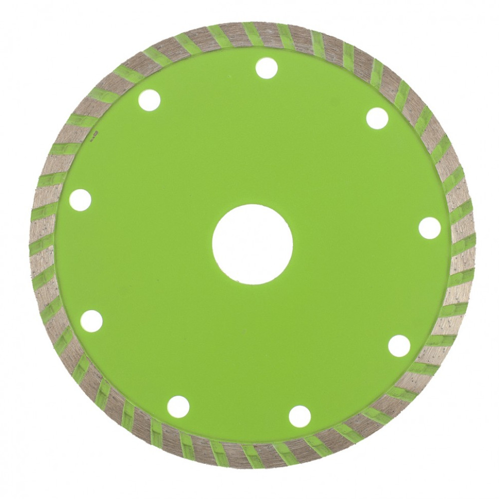 - Турбированная рабочая часть с перфорацией эффективно отводит тепло и шлам, поэтому диск можно использовать для быстрой сухой резки без водяного охлаждения.