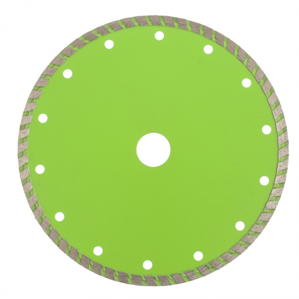 - Турбированная рабочая часть с перфорацией эффективно отводит тепло и шлам, поэтому диск можно использовать для быстрой сухой резки без водяного охлаждения.
