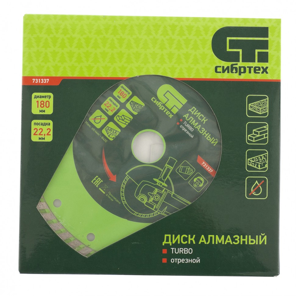 Алмазный отрезной диск Сибртех Turbo 731337 для сухой резки, 180 х 22,2 мм, устанавливается на углошлифовальные машинки и предназначен для использования в быту. Он позволяет резать твердые материалы - бетон, железобетон, камень, песчаник.