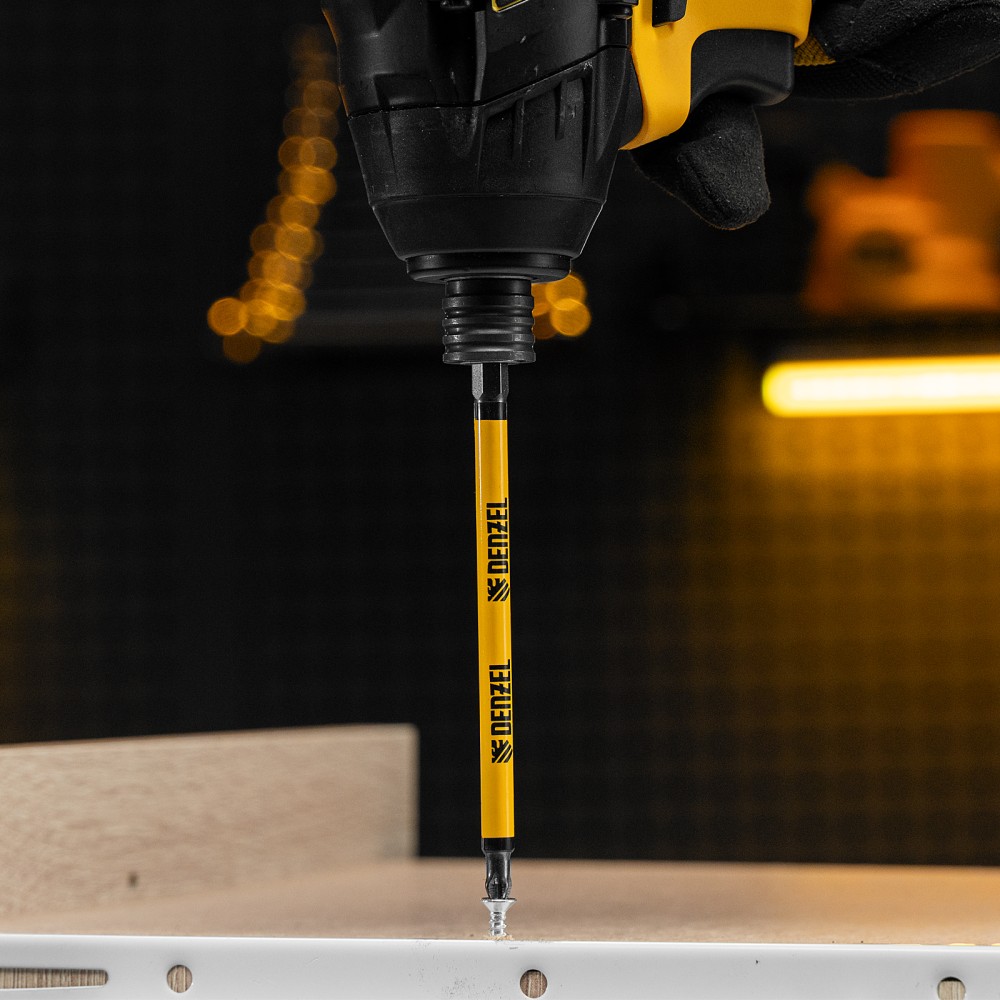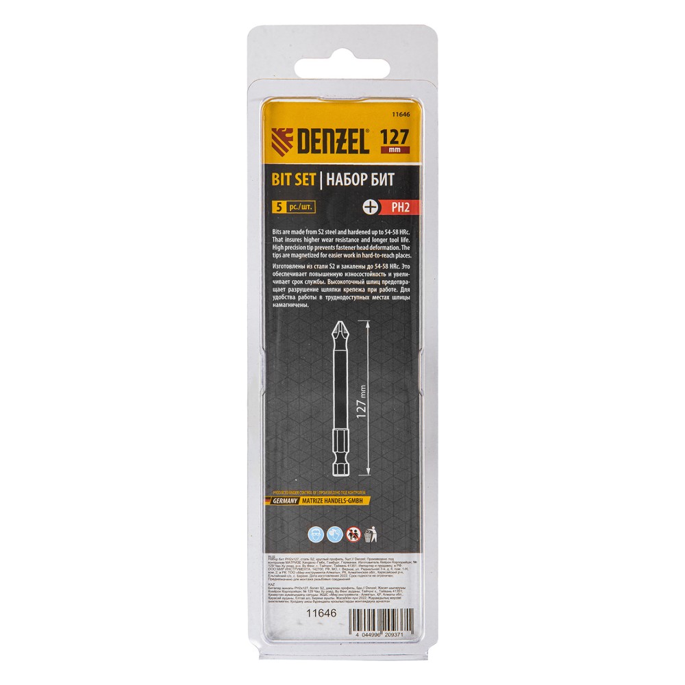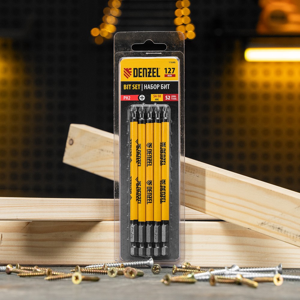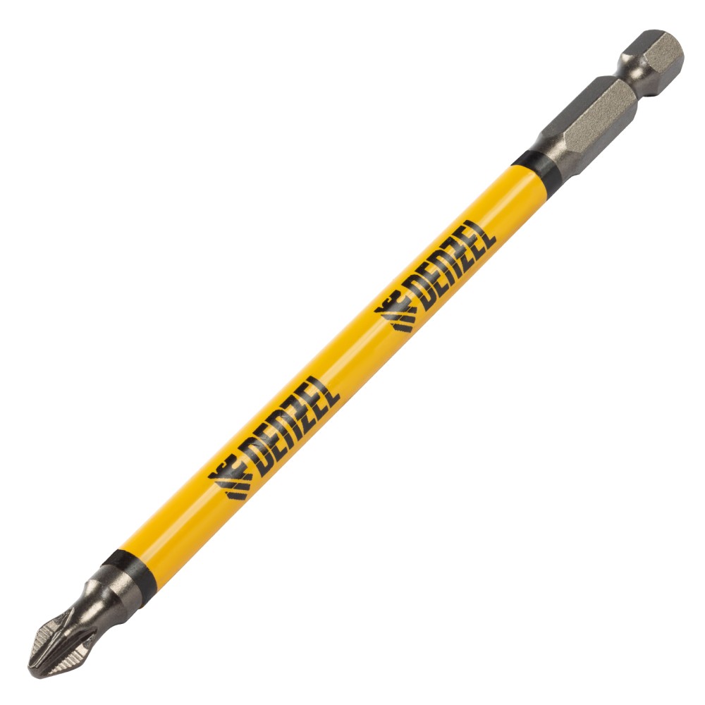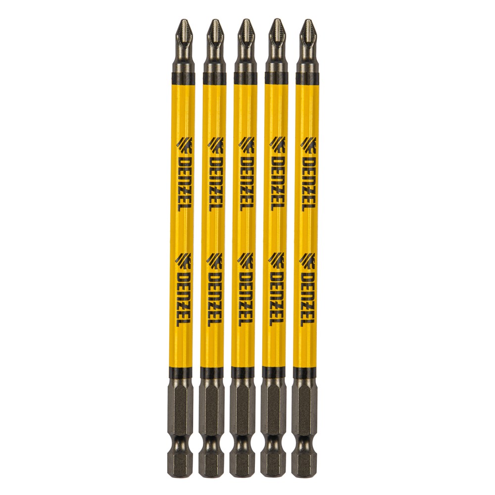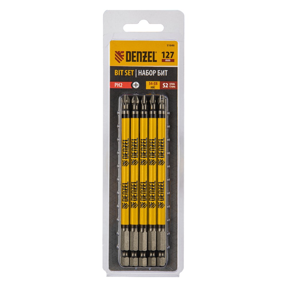 Набор односторонних бит PH2 x 127 мм Denzel 11646 — это 5 сменных насадок из стали S2 с крестообразными шлицами и шестигранными хвостовиками 1/4". Профессиональная оснастка рассчитана на работу с шуруповертом, обеспечивает быстрый монтаж и демонтаж резьбовых соединений с углублением PH2.ПреимуществаДолговечность — насечки на шлице препятствуют проскальзыванию и «слизыванию» бит, дополнительно усиливают контроль при работе с саморезами по дереву.Высокая результативность даже в ограниченном пространстве — благодаря удлиненному до 127 мм профилю битами удобно работать в труднодоступных местах.Устойчивость к деформации при больших нагрузках — биты изготовлены из японской легированной стали S2 повышенной прочности и закалены до твердости 58 HRC.Намагниченный шлиц облегчает работу — крепеж удерживается битой, поэтому свободной рукой можно придерживать закрепляемую поверхность.Антикоррозионные свойства — никелированное покрытие увеличивает срок службы насадок.5 бит в комплекте — набора хватит на небольшую бригаду.Удобная упаковка — оснастка поставляется в двойном блистере с европодвесом.