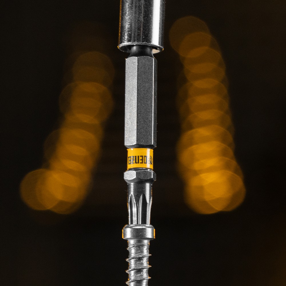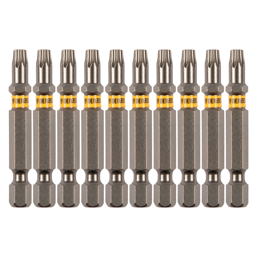 Набор бит TORX 25 х 50 мм Denzel 11670 включает в себя 10 насадок с хвостовиком 1/4", из стали S2, для работы с шуруповертами. Шлиц в форме звезды служит для быстрого монтажа и демонтажа винтов при сборке бытовой техники и электроприборов. Набор универсален и подходит как для бытового, так и для профессионального применения. Благодаря конструктивной особенности лучи «звезды» надежно сцепляются с крепежом, нагрузка равномерно распределяется на все грани, это снижает риск соскальзывания биты и обеспечивает высокую точность работ.ПреимуществаДолговечность и надежность — биты сделаны из японской легированной стали S2 и закалены до твердости 58 HRC, поэтому устойчивы к высоким нагрузкам.Высокое качество — точное исполнение шлица и максимальный контроль на производстве в Тайване позволяют добиться выверенности каждой биты и предотвратить проскальзывание рабочей части в головке крепежа.Удобная работа — намагниченный шлиц позволяет направлять шуруповерт с насаженным крепежом одной рукой, а другой придерживать закрепляемую деталь.Антикоррозионные свойства — защитное никелированное покрытие продлевает срок службы насадок.Каждая бита защищена от подделок — об этом свидетельствует цветное кольцо с логотипом ТМ Denzel.Удобное хранение — оснастка поставляется в двойном блистере с европодвесом.Большой запас — набора из 10 штук достаточно для снабжения бригады работников.