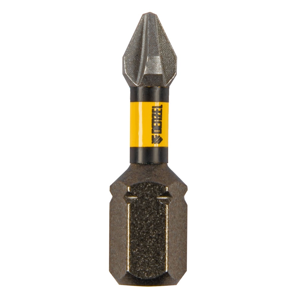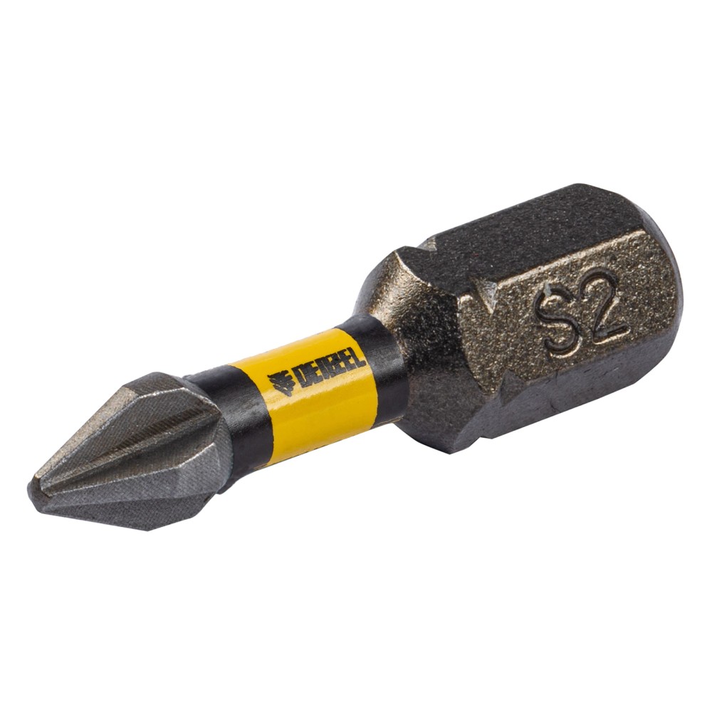 Набор бит торсионных PH1 x 25 мм Denzel 11684 с лазерной обработкой шлица, из стали S2, 10 шт., предназначен для монтажа и демонтажа резьбовых соединений с помощью ударного шуруповерта. Он незаменим в строительных, слесарных и монтажных работах, в автосервисах, при проведении ремонта в доме.,Торсионная зона способна пружинить, за счет чего она частично амортизирует тангенциальный удар от шуруповерта. Такое решение позволяет равномерно распределить нагрузку по бите, избежать поломки шлица и в разы увеличить объем работы, проделанный одной насадкой.ПреимуществаПродуманная конструкция — торсионная зона позволяет работать ударным шуруповертом даже с особо твердыми поверхностями без риска поломки бит.Высококачественный материал изготовления — японская легированная сталь S2 обеспечивает устойчивость бит к износу и увеличивает их ресурс.Износостойкость — биты закалены до твердости 62 HRC, что повышает сопротивляемость к деформации при высоких нагрузках.Надежная фиксация — шлицы бит намагничены, поэтому крепеж не выпадет, а мастер сможет свободной рукой придерживать закрепляемый материал.Антикоррозионные свойства — никелированное покрытие увеличивает срок службы насадок.Защита от подделок — цветное кольцо с логотипом ТМ Denzel подтверждает оригинальность товара.Удобное хранение — насадки поставляются в блистере с европодвесом, который можно вешать на стенд.10 бит в комплекте — набора хватит на небольшую производственную бригаду.