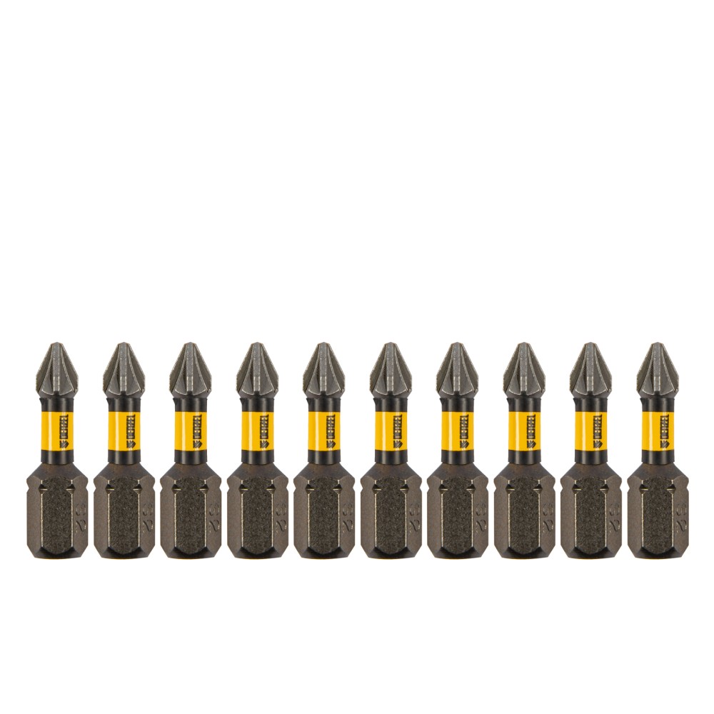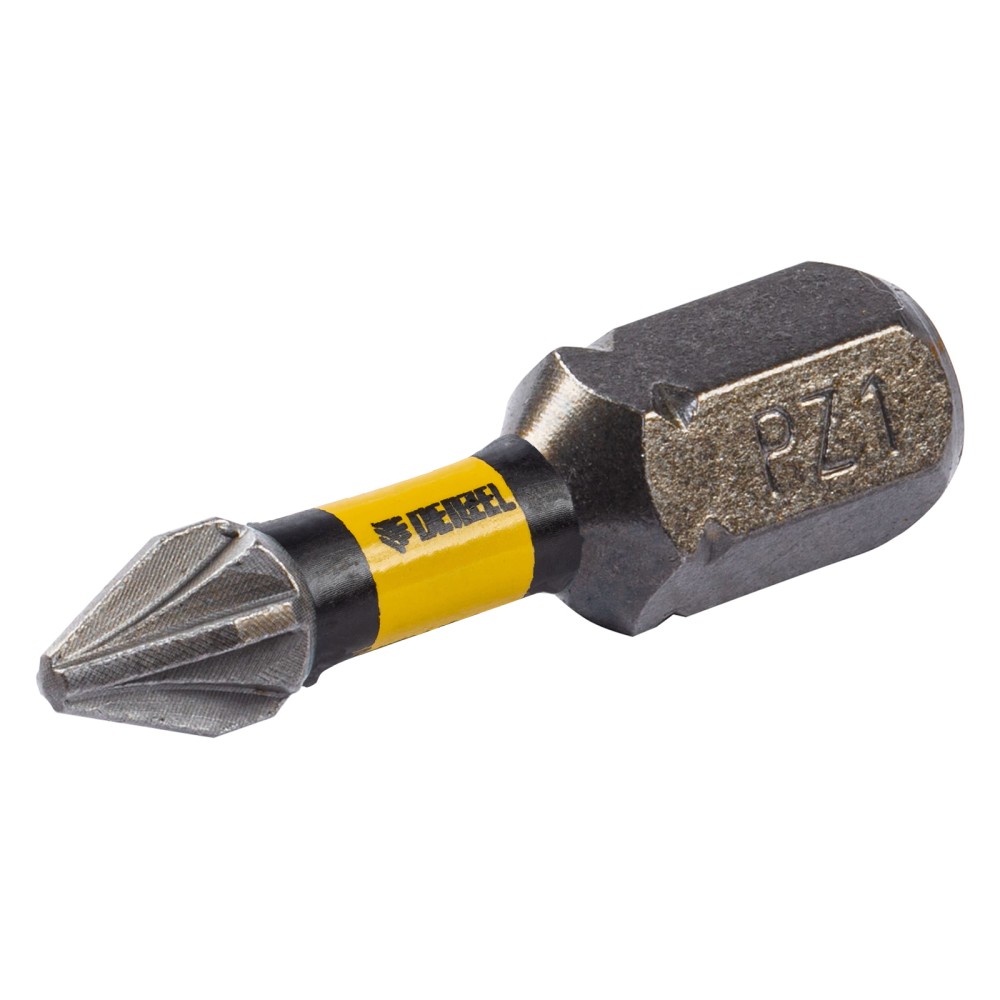 Набор бит торсионных PZ1 x 25 мм Denzel 11686 с лазерной обработкой шлица, из стали S2, 10 шт., предназначен для монтажа и демонтажа резьбовых соединений с помощью ударного шуруповерта. Он незаменим в строительных, слесарных и монтажных работах, в автосервисах, при проведении ремонта в доме.,Торсионная зона способна пружинить, за счет чего она частично амортизирует тангенциальный удар от шуруповерта. Такое решение позволяет равномерно распределить нагрузку по бите, избежать поломки шлица и в разы увеличить объем работы, проделанный одной насадкой.ПреимуществаДополнительные выступы между гранями — риск выскальзывания шлица из головки крепежа и поломки сведен к минимуму.Продуманная конструкция — торсионная зона позволяет работать ударным шуруповертом даже с особо твердыми поверхностями без риска поломки бит.Высококачественный материал изготовления — японская легированная сталь S2 обеспечивает устойчивость бит к износу и увеличивает их ресурс.Износостойкость — биты закалены до твердости 62 HRC, что повышает сопротивляемость к деформации при высоких нагрузках.Надежная фиксация — шлицы бит намагничены, поэтому крепеж не выпадет, а мастер сможет свободной рукой придерживать закрепляемый материал.Антикоррозионные свойства — никелированное покрытие увеличивает срок службы насадок.Защита от подделок — цветное кольцо с логотипом ТМ Denzel подтверждает оригинальность товара.Удобное хранение — насадки поставляются в блистере с европодвесом, который можно вешать на стенд.10 бит в комплекте — набора хватит на небольшую производственную бригаду.