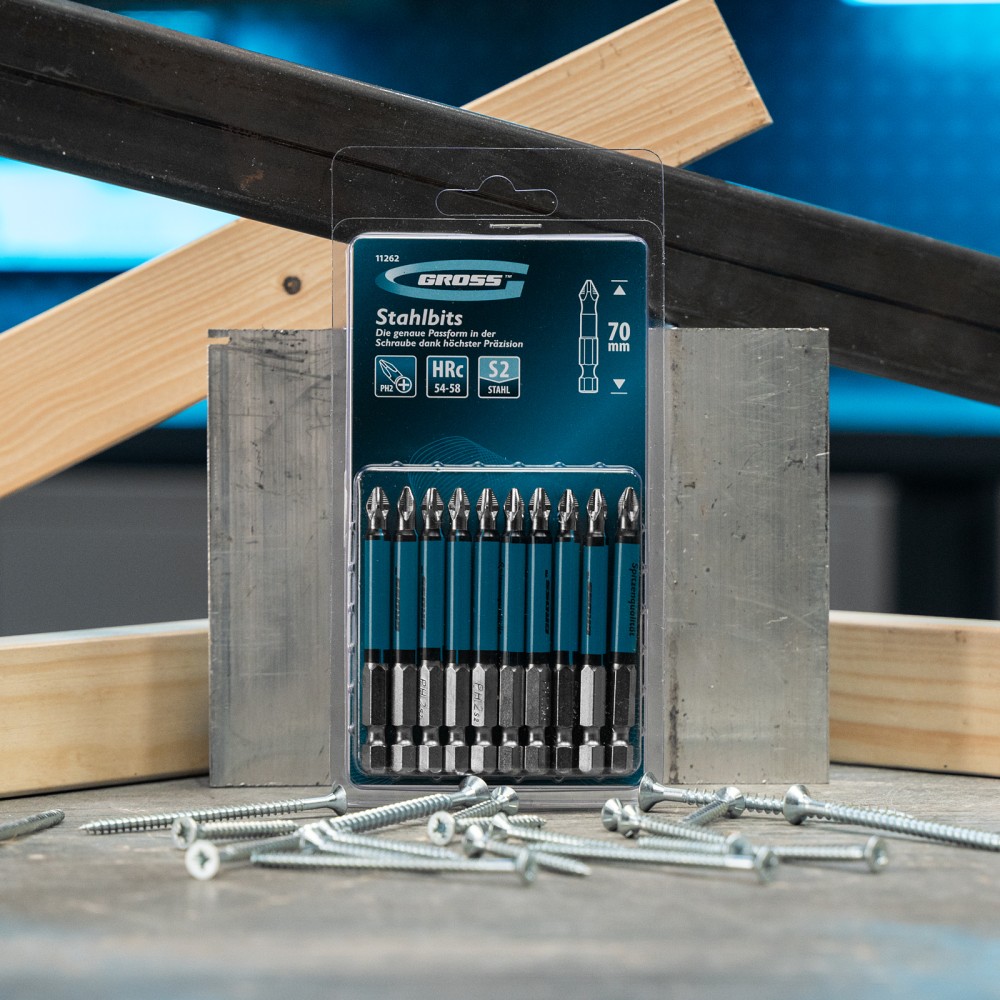 Набор односторонних бит с круглым профилем PH2 x 70 мм Gross 11262 — это 10 сменных насадок из стали S2 с крестообразными шлицами и шестигранными хвостовиками 1/4 дюйма, рассчитанные на работу с шуруповертом. Профессиональная оснастка обеспечивает быстрый монтаж и демонтаж резьбовых соединений с углублением PH2.ПреимуществаДолговечность — насечки на шлице препятствуют проскальзыванию и «слизыванию» бит, дополнительно усиливают контроль при работе с саморезами по дереву.Высокая результативность даже в ограниченном пространстве — благодаря удлиненному профилю 70 мм битами удобно работать в труднодоступных местах.Износоустойчивость — биты изготовлены из японской легированной стали S2 повышенной прочности и закалены до твердости 54-58 HRC.Намагниченный шлиц облегчает работу — крепеж удерживается битой, поэтому свободной рукой можно придерживать закрепляемую поверхность.Антикоррозионные свойства — никелированное покрытие увеличивает срок службы насадок.10 бит в комплекте — набора хватит на целую бригаду.Удобная упаковка — оснастка поставляется в жестком блистере с европодвесом.