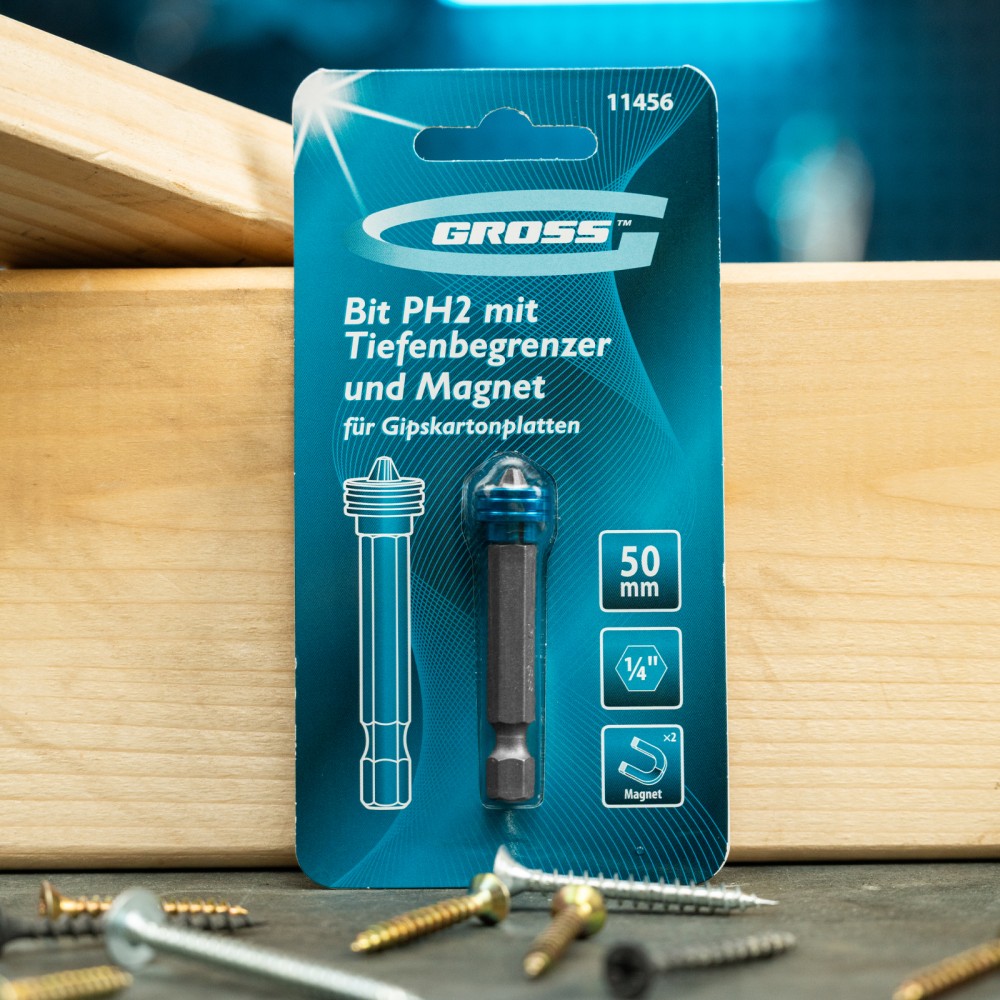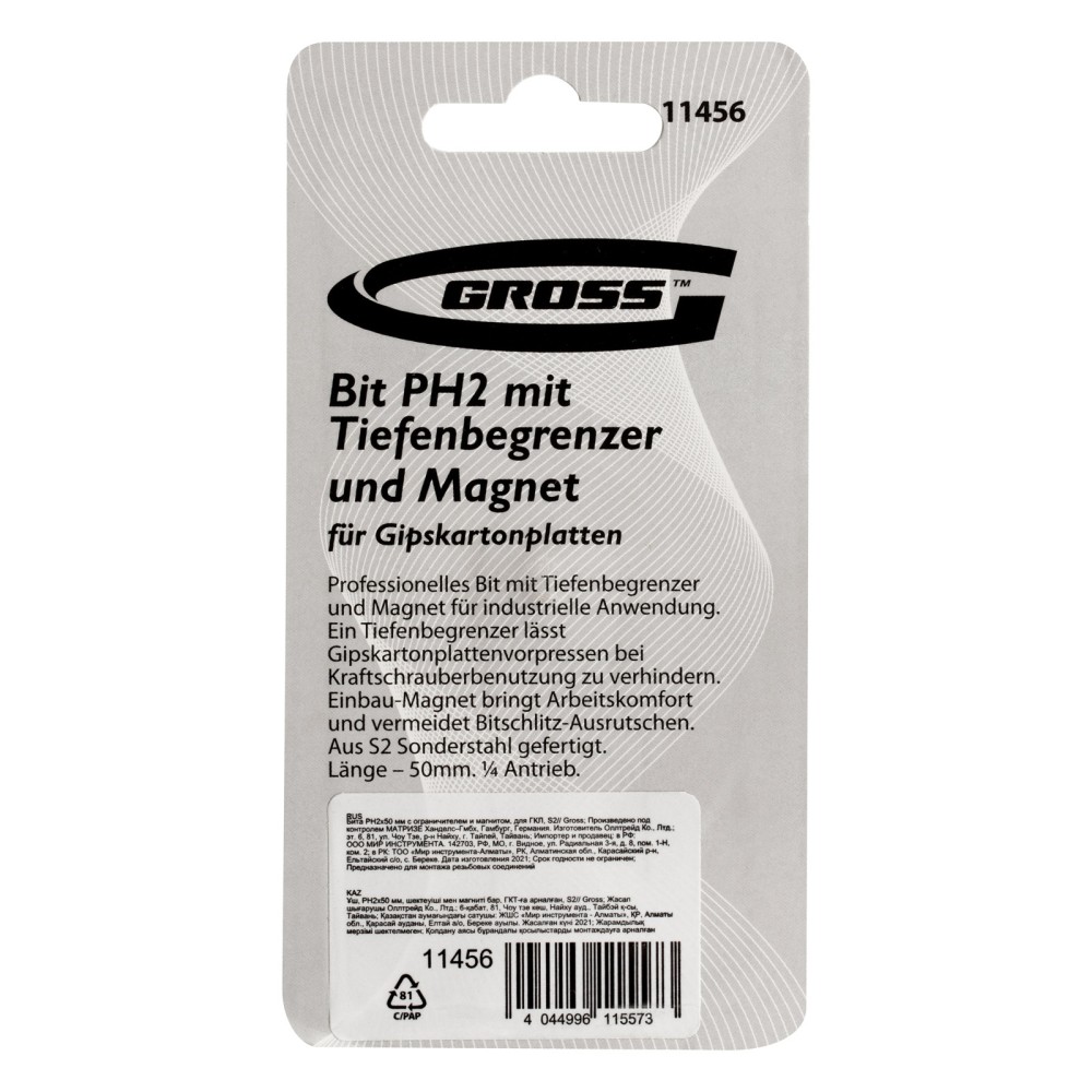 Бита Gross 11456 типоразмера PH2 x 50 мм, из стали S2, c ограничителем и магнитом, оптимально подходит для монтажа и демонтажа саморезов в гипсокартонные листы. Используется в качестве оснастки для шуруповертов и отверток. Благодаря встроенному ограничителю хода крепеж ввинчивается на необходимую глубину, что позволяет избежать повреждения материалов и экономит время мастера.ПреимуществаВстроенный магнит — крепеж надежно фиксируется в шлице биты, что позволяет работать шуруповертом одной рукой, а другой удерживать ГКЛ.Надежность и долговечность — бита изготовлена из японской легированной стали S2 повышенной износостойкости.Защита от воздействия влаги — на поверхность насадки нанесено антикоррозийное никелевое покрытие.Комфортная работа — шлиц не проскальзывает в головке крепежа, т.к. бита изготовлена на высокоточном оборудовании с максимальным контролем качества.
