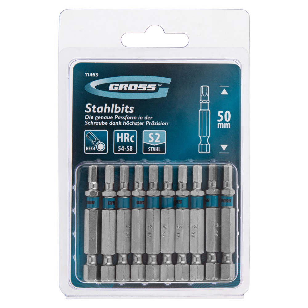 Набор бит Gross 11463 состоит из 10 сменных насадок HEX 4 х 50 мм с шестигранным хвостовиком 1/4 дюйма, изготовленных из стали S2, которые используются в качестве оснастки на шуруповертах. Биты типоразмера HEX4 предназначены для монтажа и демонтажа мебельных и велосипедных евровинтов. Шестигранный шлиц обеспечивает большую площадь соприкосновения с крепежом, что позволяет увеличить крутящий момент без риска повреждения биты. ПреимуществаПрочность и долговечность — биты изготовлены из японской легированной стали S2 твердостью 54-58 HRC.Эффективность — благодаря высокоточному исполнению шлица рабочая часть не проскальзывает в головке крепежа. Намагниченные шлицы — шуруповерт с насаженным крепежом можно направлять одной рукой, а другой придерживать закрепляемую деталь.Защита от коррозии — никелированное покрытие предохраняет биты от воздействия влаги.Длина насадок 50 мм — можно работать в ограниченном пространстве и в труднодоступных местах.Защита от подделок — цветное кольцо с логотипом ТМ Gross подтверждает оригинальность каждой биты.Удобная упаковка — оснастки поставляются в жестком блистере с европодвесом, а запаса из 10 штук хватит на целую бригаду.Высокое качество — биты изготовлены на современном оборудовании в Тайване и прошли строгий технологический контроль.