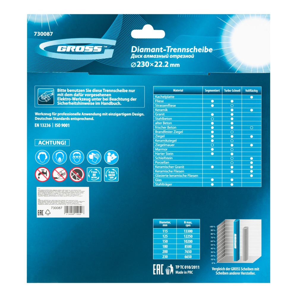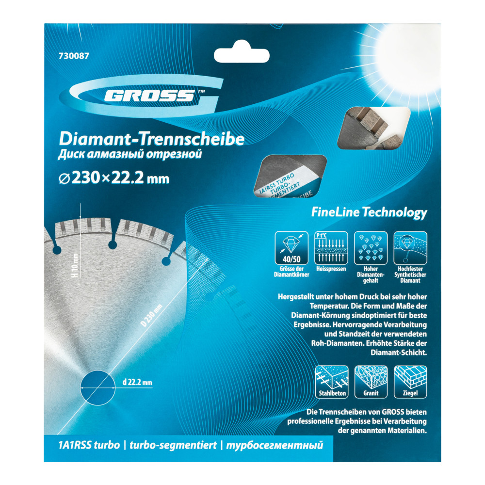 Алмазный диск Gross ф230х22,2 мм 730087 с лазерной приваркой турбо-сегментов предназначен для сухого резания бетона, в том числе свежего, слабоармированного железобетона, кирпича, песчаника и гранита. Посадочный диаметр 22,2 мм позволяет использовать диск в качестве расходного инструмента для УШМ. Турбо-сегменты обеспечивают быстрое сухое резание без необходимости водяного охлаждения. За счет оптимально подобранной связки диск выдерживает перегрузки и подходит как для интенсивного бытового, так и для профессионального применения, когда требуется выполнить большой объем работ.